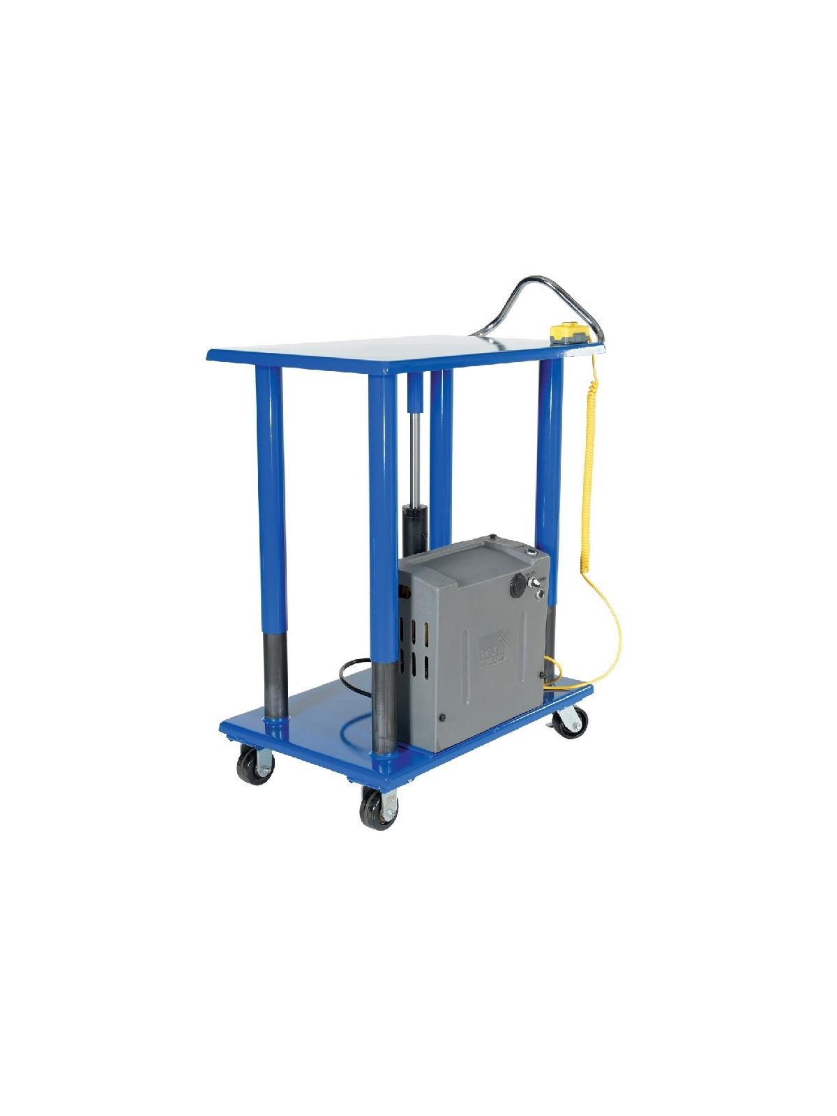 Hydraulic center post lifts tabletop with rigidity. Models with corner posts are telescoping to help stabilize and fully support the load during operation. Rolls smoothly on durable heavy duty casters. FOB Shipping Point.