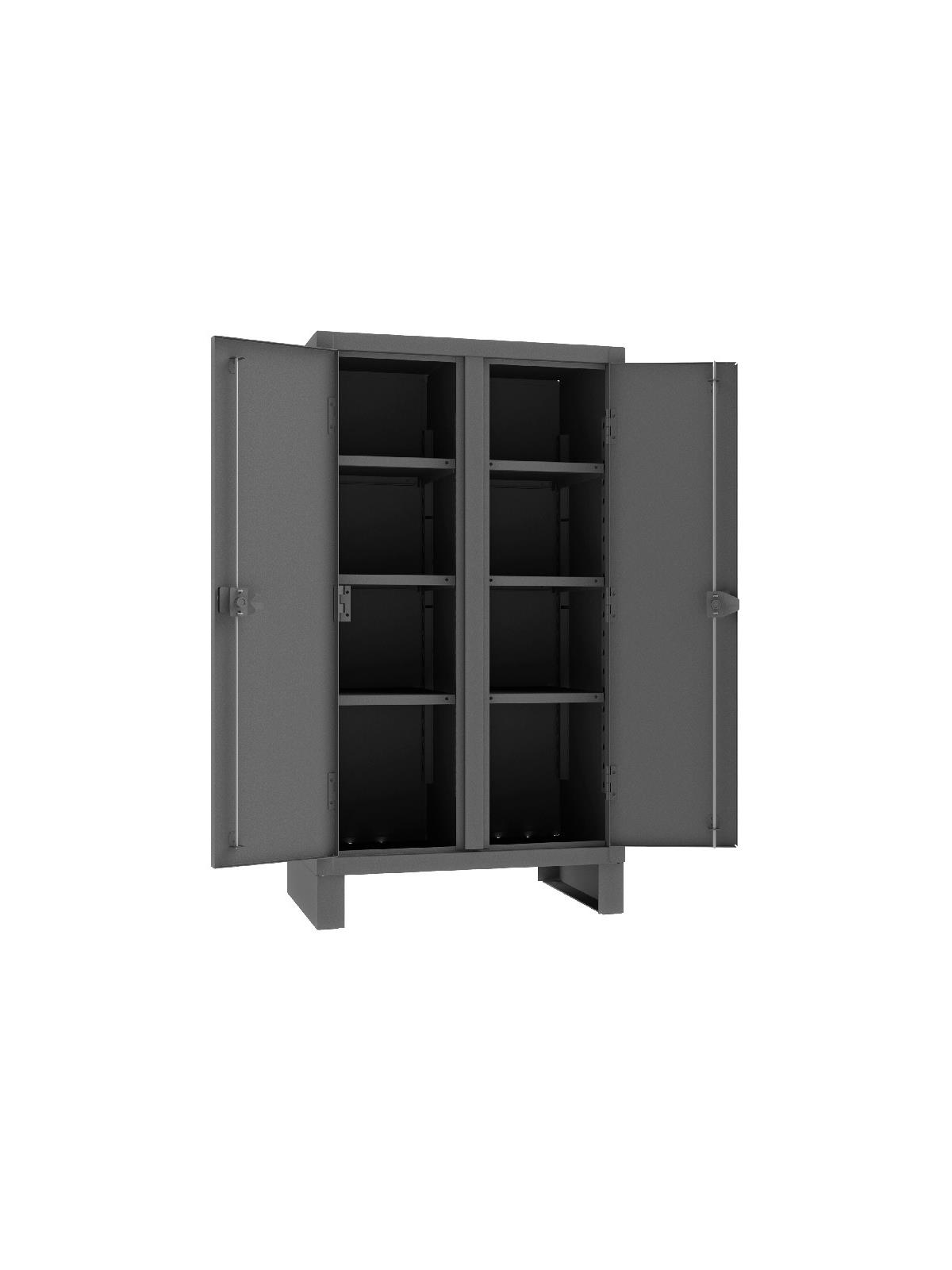 Feature rugged, all-welded 12 ga. steel construction and handsome flush door design. 4 reinforced steel shelves are adjustable on 2-1/2” centers. Includes extra heavy-duty hinge pins that secure doors to avoid sagging. Sturdy 3-point, cast steel locking handles have 3/8” dia. rods and provision for padlock (padlock not furnished).  6" high box style legs offer space for lift truck forks and can be lagged to the floor, constructed of 3/16" steel. Durable Gray powder coat finish. FOB Shipping Point.