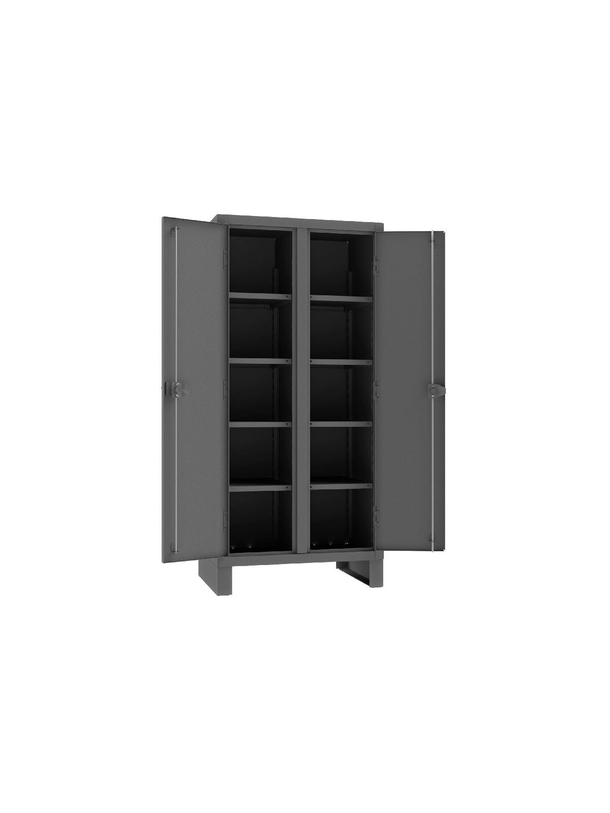Feature rugged, all-welded 12 ga. steel construction and handsome flush door design. 4 reinforced steel shelves are adjustable on 2-1/2” centers. Includes extra heavy-duty hinge pins that secure doors to avoid sagging. Sturdy 3-point, cast steel locking handles have 3/8” dia. rods and provision for padlock (padlock not furnished).  6" high box style legs offer space for lift truck forks and can be lagged to the floor, constructed of 3/16" steel. Durable Gray powder coat finish. FOB Shipping Point.