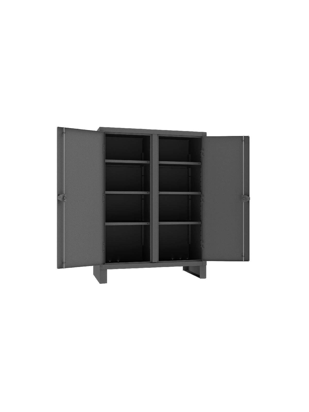 Feature rugged, all-welded 12 ga. steel construction and handsome flush door design. 4 reinforced steel shelves are adjustable on 2-1/2” centers. Includes extra heavy-duty hinge pins that secure doors to avoid sagging. Sturdy 3-point, cast steel locking handles have 3/8” dia. rods and provision for padlock (padlock not furnished).  6" high box style legs offer space for lift truck forks and can be lagged to the floor, constructed of 3/16" steel. Durable Gray powder coat finish. FOB Shipping Point.