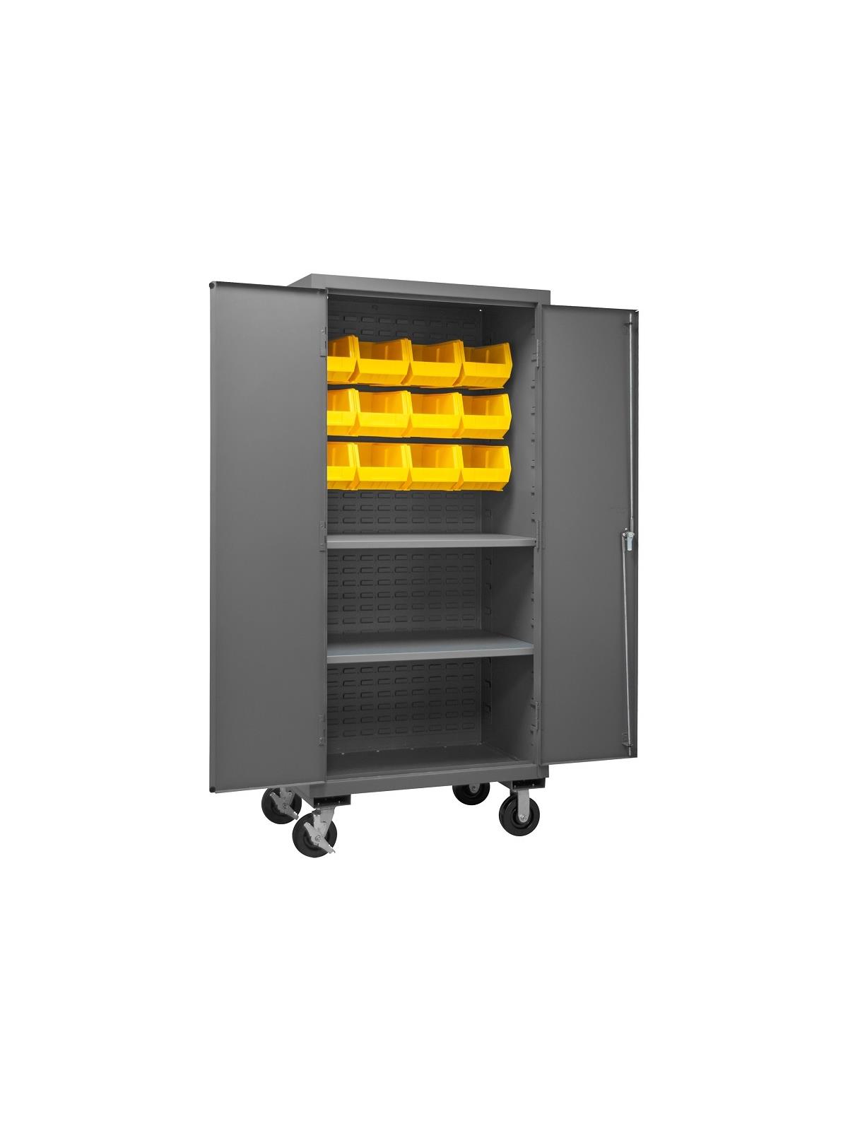 Heavy duty, all welded 14-gauge steel with 6" x 2" phenolic casters (2 rigid, 2 locking swivel). 3-point locking system with keyed handle and lock rods, 4 keys included. Side handle for easy maneuvering. Fully welded louvered panels reinforce back and hold Hook-On-Bins® and adjustable shelves rest on louvered panels and adjust on 4"centers. No tools required for installation. Hook-On-Bins® by Durham are included and install with no tools required. Gray textured powder coat finish. Available in three bin colors, Red (-1795), Blue (-5295), or Yellow (-95). FOB Shipping Point.