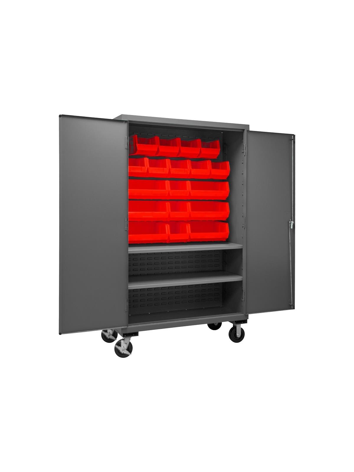 Heavy duty, all welded 14-gauge steel with 6" x 2" phenolic casters (2 rigid, 2 locking swivel). 3-point locking system with keyed handle and lock rods, 4 keys included. Side handle for easy maneuvering. Fully welded louvered panels reinforce back and hold Hook-On-Bins® and adjustable shelves rest on louvered panels and adjust on 4"centers. No tools required for installation. Hook-On-Bins® by Durham are included and install with no tools required. Gray textured powder coat finish. Available in three bin colors, Red (-1795), Blue (-5295), or Yellow (-95). FOB Shipping Point.