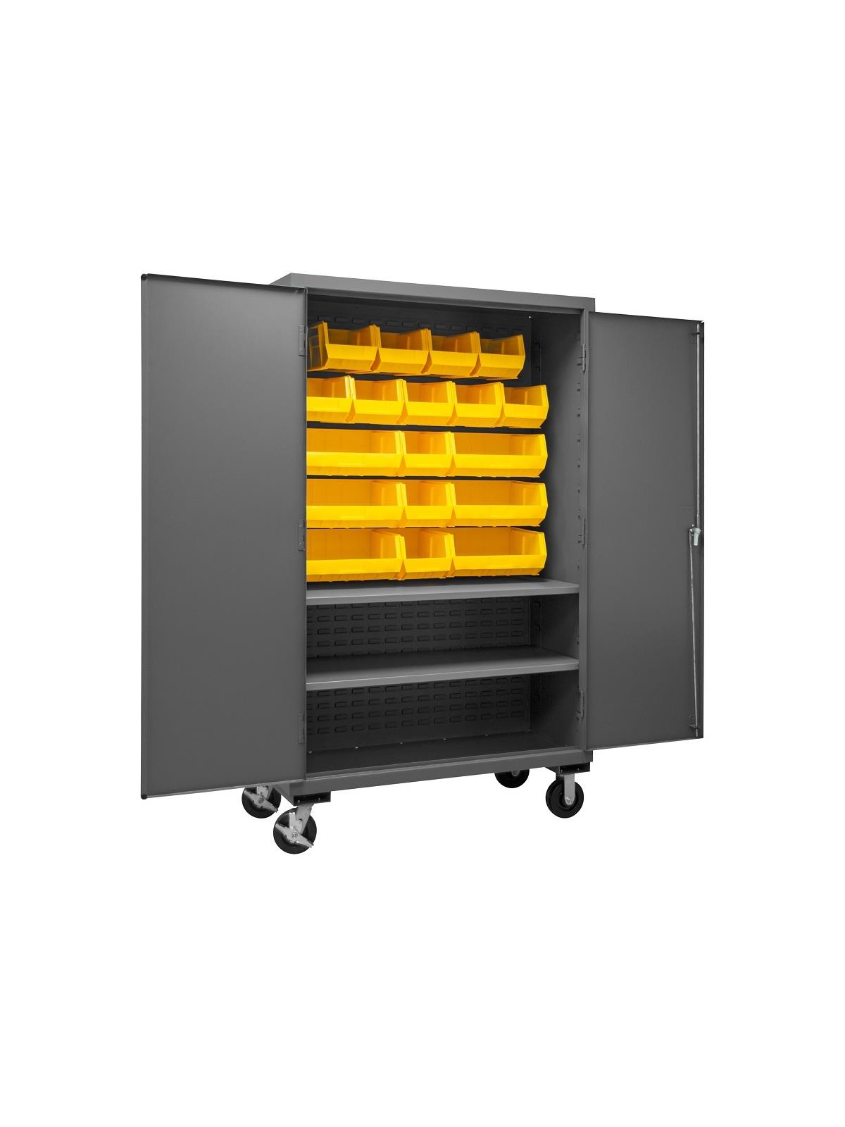 Heavy duty, all welded 14-gauge steel with 6" x 2" phenolic casters (2 rigid, 2 locking swivel). 3-point locking system with keyed handle and lock rods, 4 keys included. Side handle for easy maneuvering. Fully welded louvered panels reinforce back and hold Hook-On-Bins® and adjustable shelves rest on louvered panels and adjust on 4"centers. No tools required for installation. Hook-On-Bins® by Durham are included and install with no tools required. Gray textured powder coat finish. Available in three bin colors, Red (-1795), Blue (-5295), or Yellow (-95). FOB Shipping Point.