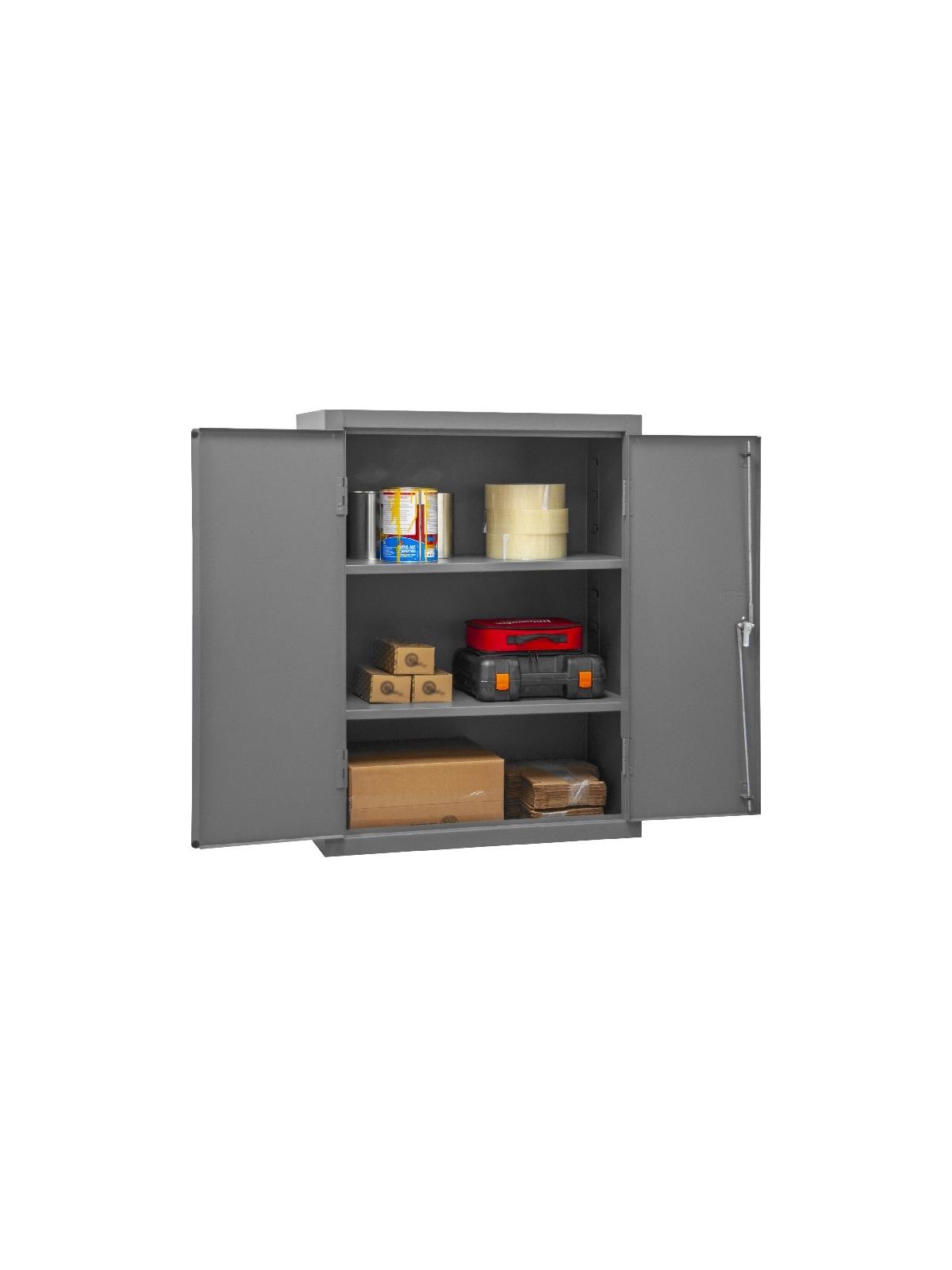 Industrial duty, all welded 16-gauge steel with 3-point locking system with keyed handle and lock rods, 4 keys included. Adjustable shelves rest on louvered panels and adjust on 4" centers. No tools required for installation. H2505 & H2506 models have 6"H base/legs which provide access for forklifts, pre-punched holes allow for lagging to the floor. (Constructed of 3/16" steel) Gray, textured powder coat finish. FOB Shipping Point.