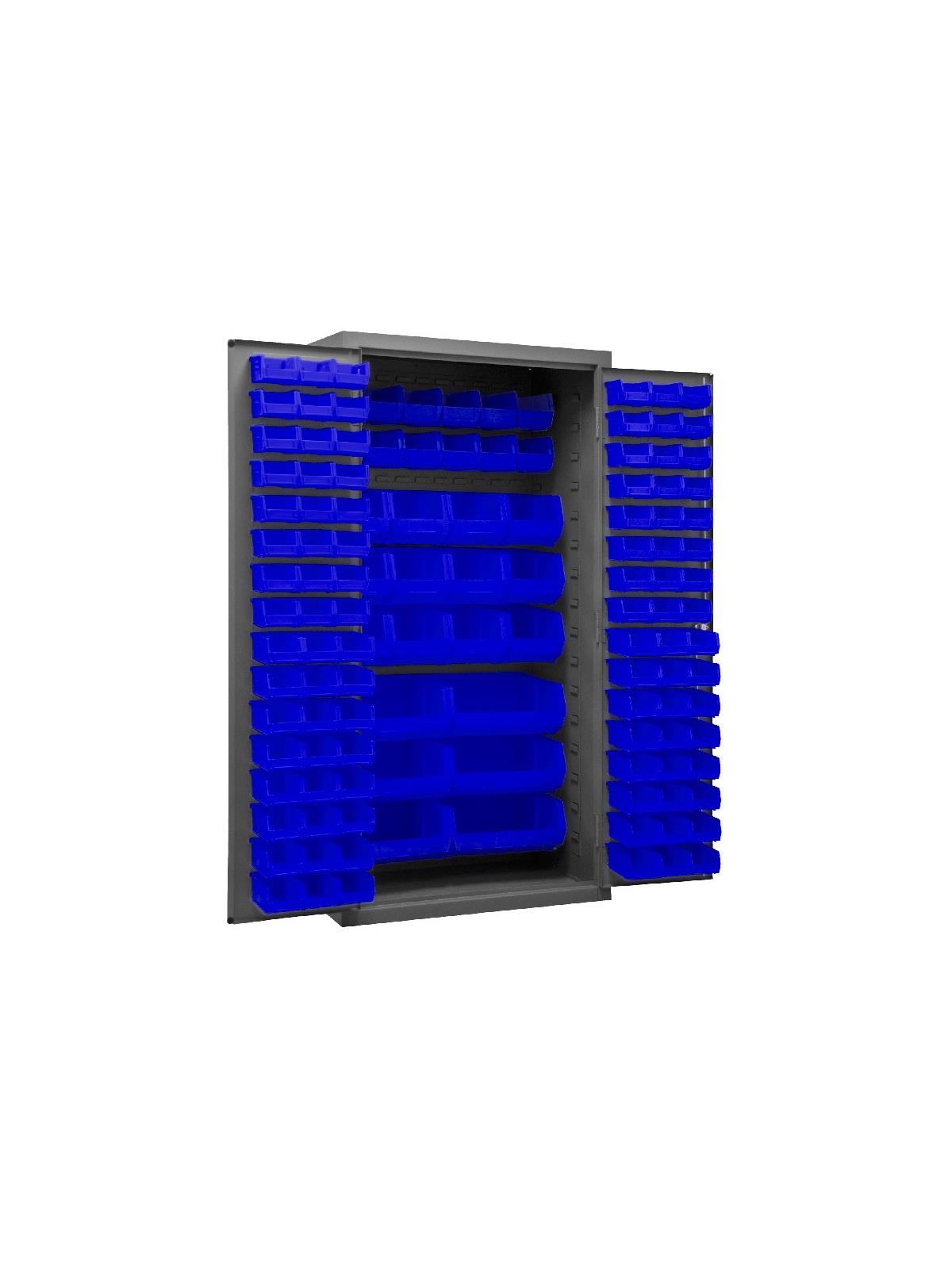 3-point locking system with keyed handle and lock rods, 4 keys included. Full height, formed and recessed doors with heavy duty, leaf hinges to prevent sagging and warping. Fully welded louvered panels reinforce door and accommodates Hook-On-Bins®. Hook-On-Bins® installed easily with no tools required. Hook-On-Bins® are included. Durable, gray textured powder coat finish. Available in three bin colors, Red (-1795), Blue (-5295), or Yellow (-95). FOB Shipping Point.