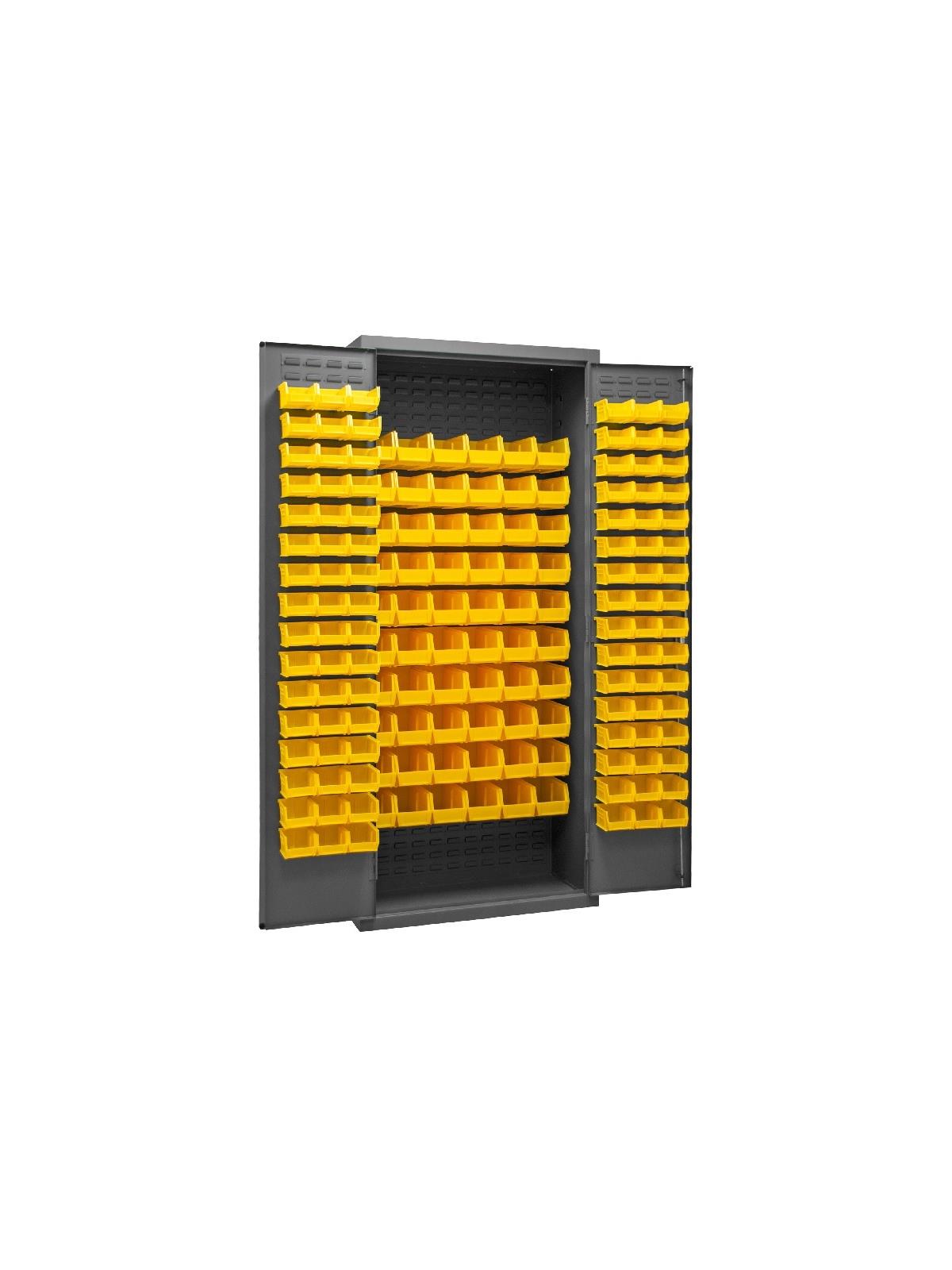 3-point locking system with keyed handle and lock rods, 4 keys included. Full height, formed and recessed doors with heavy duty, leaf hinges to prevent sagging and warping. Fully welded louvered panels reinforce door and accommodates Hook-On-Bins®. Hook-On-Bins® installed easily with no tools required. Hook-On-Bins® are included. Durable, gray textured powder coat finish. Available in three bin colors, Red (-1795), Blue (-5295), or Yellow (-95). FOB Shipping Point.