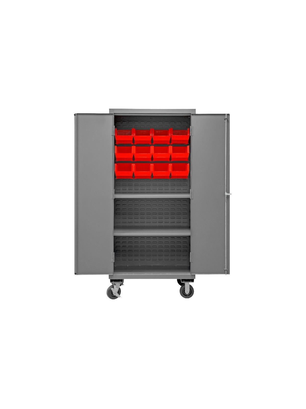 Industrial duty, all welded 16-gauge steel with 6" x 2" phenolic casters (2 rigid, 2 locking swivel). 3-point locking system with keyed handle and lock rods, 4 keys included. Side handle for easy maneuvering. Fully welded louvered panels reinforce back and hold Hook-On-Bins® and adjustable shelves rest on louvered panels and adjust on 4" centers. No tools required for installation. Hook-On-Bins® by Durham are included and install with no tools required. Gray textured powder coat finish. Available in three bin colors, Red (-1795), Blue (-5295), or Yellow (-95). FOB Shipping Point.