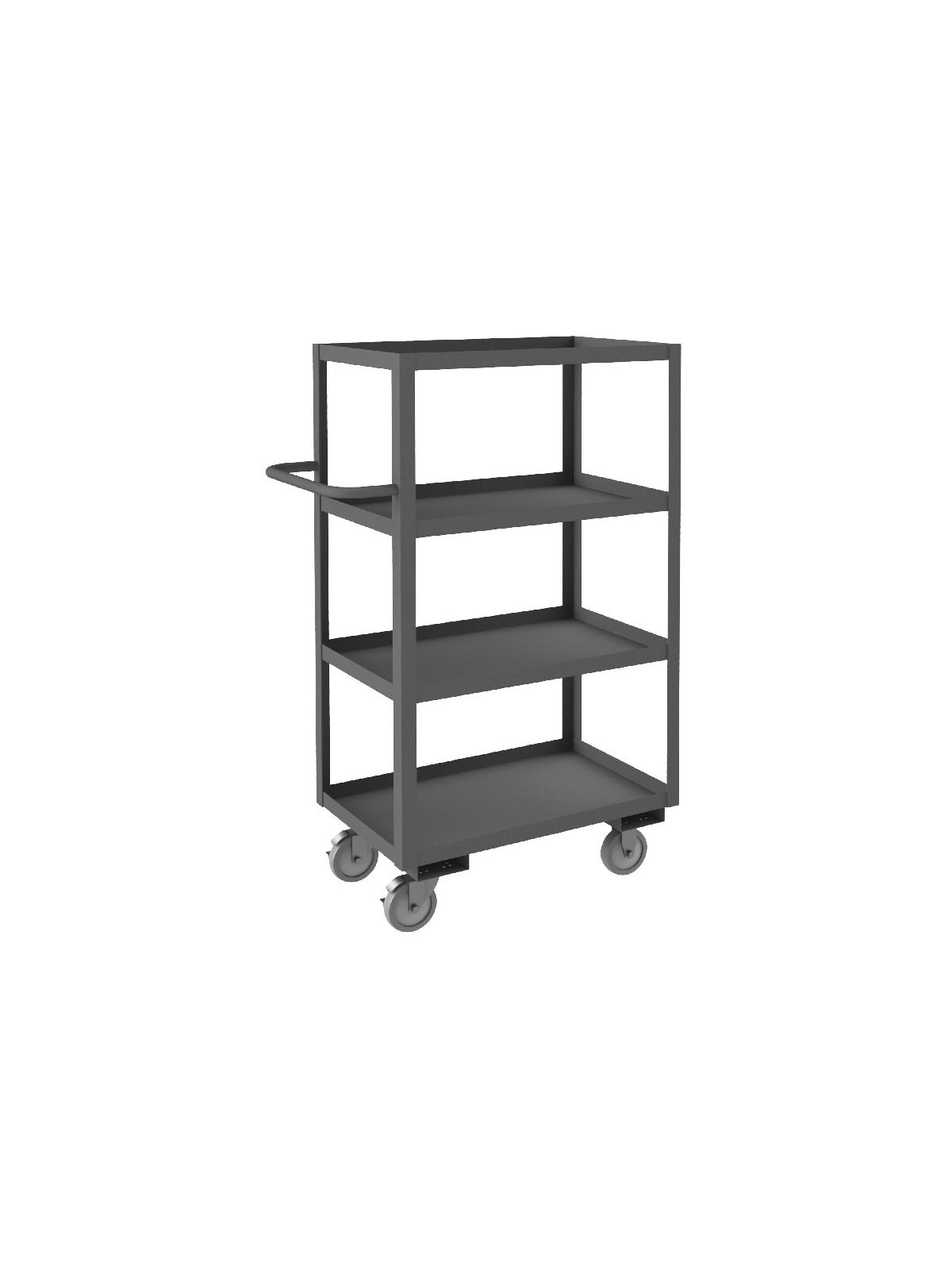 Shelf carts are constructed with 1-1/2" x 1/8" angle iron uprights for added strength. Heavy duty 14 gauge steel shelves. Sturdy tubular push handle. Perfect for transporting heavier parts or stock items. Shelf Stock Carts are available in 1,200 lbs. or 3,000 lbs. capacities. FOB Shipping Point.