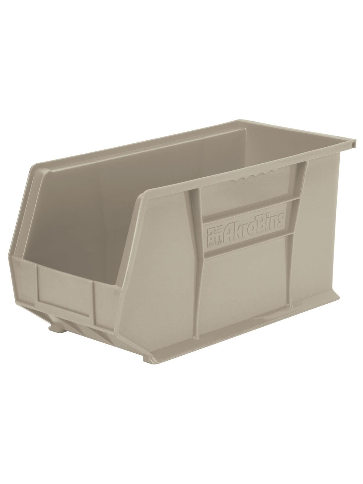 AkroBins are heavy-duty and securely stack on top of each other, sit on shelving, and hang from Akro-Mils racks, panels, rails and carts. Unaffected by weak acids and alkalis the sturdy one piece construction is water, rust and corrosion-proof. Finger grip allows for easy handling. Large label slot for easy identification of contents. Autoclavable up to 250° F. Guaranteed not to crack or break under normal load conditions as stated in the 1-year limited warranty. Optional dividers and labels available, see Related Items tab. AkroBins available in Red, Yellow, Blue, Green, Black, Stone, and Semi-Clear. FOB Shipping Point.