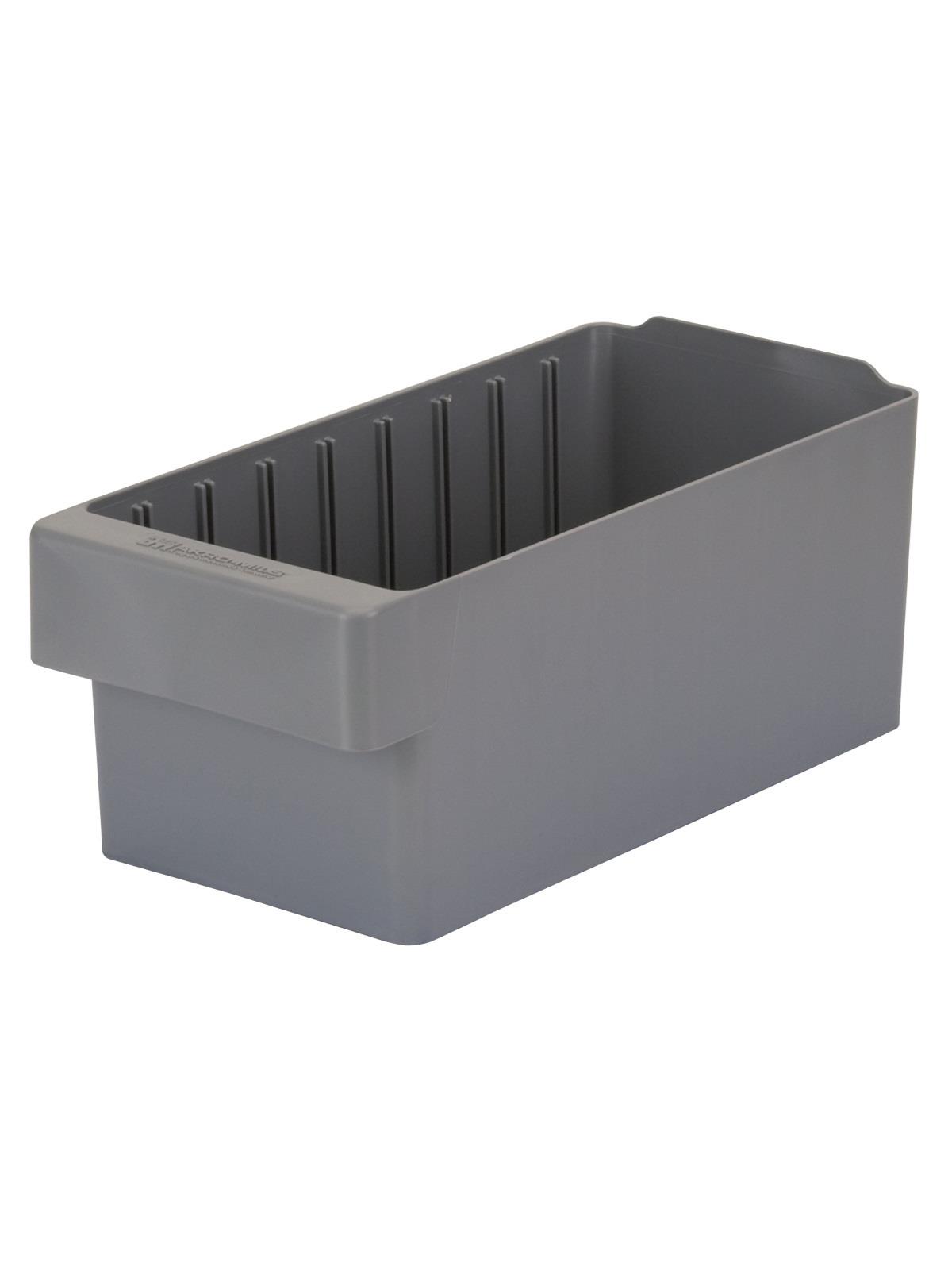 Offered in 12" or 18" depths to work with compatible shelving. Easy to label and color code inventory for quick identification of parts and supplies. Drawers can be stacked to optimize space. Wide front handle for easy gripping when AkroDrawers are loaded or contain heavy contents. Can be used with available shelving, racks, mobile carts or can be used by themselves. Sturdy back stop tab ensures AkroDrawers can hang securely from shelves. Dividers are available to keep contents neatly separated in drawers. Available in Blue, Gray, Yellow, Red and Clear - Minimum order required. FOB Shipping Point.