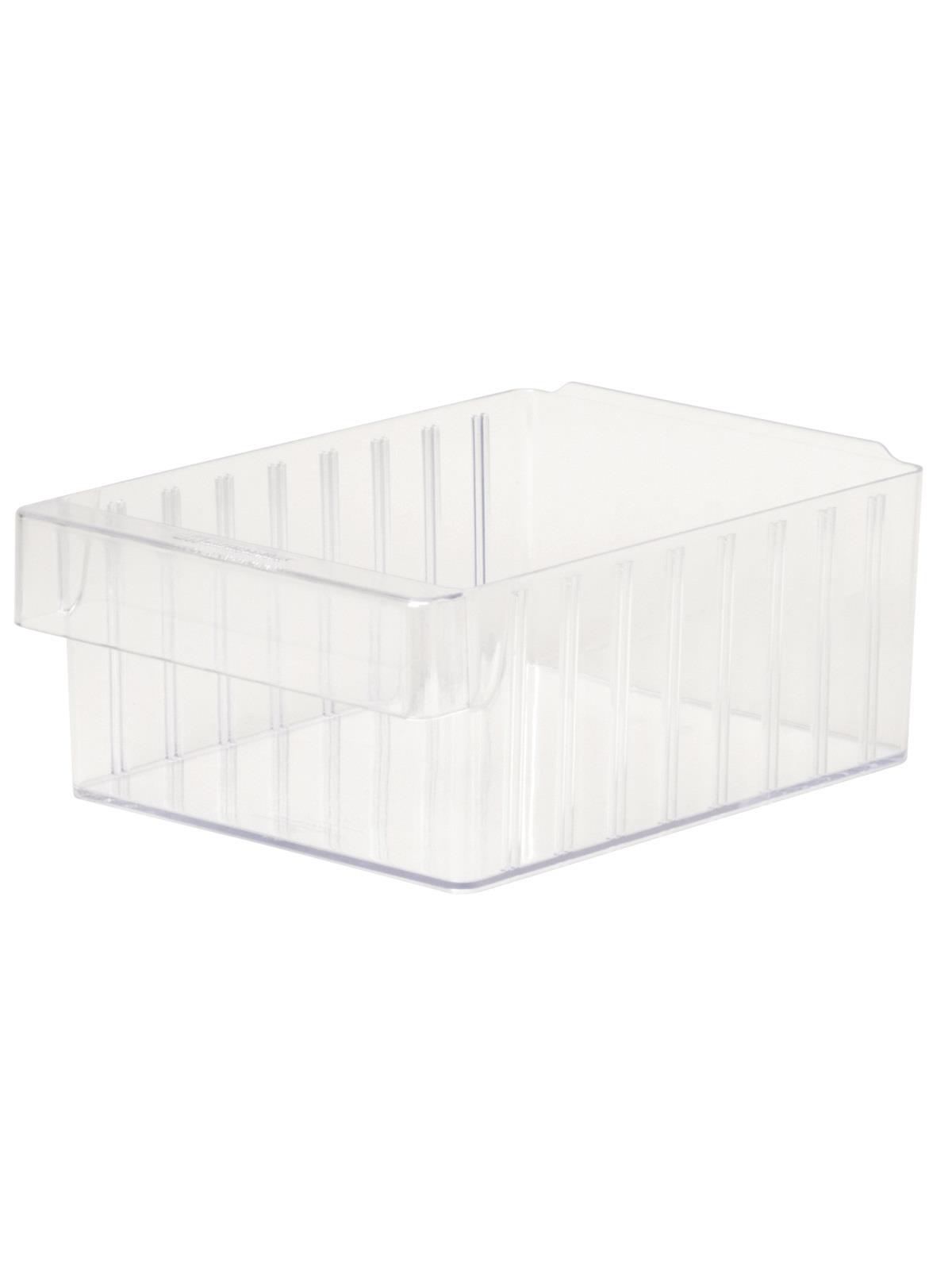Offered in 12" or 18" depths to work with compatible shelving. Easy to label and color code inventory for quick identification of parts and supplies. Drawers can be stacked to optimize space. Wide front handle for easy gripping when AkroDrawers are loaded or contain heavy contents. Can be used with available shelving, racks, mobile carts or can be used by themselves. Sturdy back stop tab ensures AkroDrawers can hang securely from shelves. Dividers are available to keep contents neatly separated in drawers. Available in Blue, Gray, Yellow, Red and Clear - Minimum order required. FOB Shipping Point.