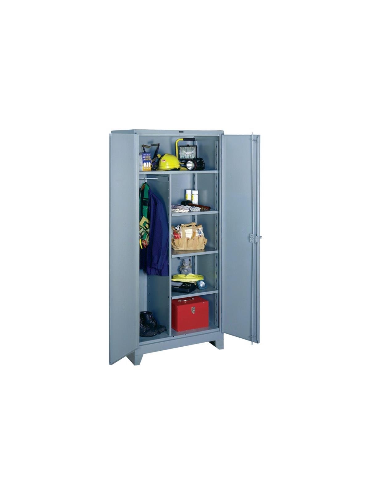 All-welded 14-gauge steel construction provides a payload capacity of 1,450 lbs. per shelf. Rugged cast iron handle features a 3/8" thick padlock hasp (lock not included) and 3 heavy-duty 5/16" brass pin hinge plates welded to each door. Secure, 3-point locking system on doors features 3/8" latch rod and 3/16" latch plate. Shelves bolt securely into welded keyhole slots and can be repositioned on 3" centers. Additional shelves are available - call for details. 4" high legs welded to cabinet create a forklift base. FOB Shipping Point.