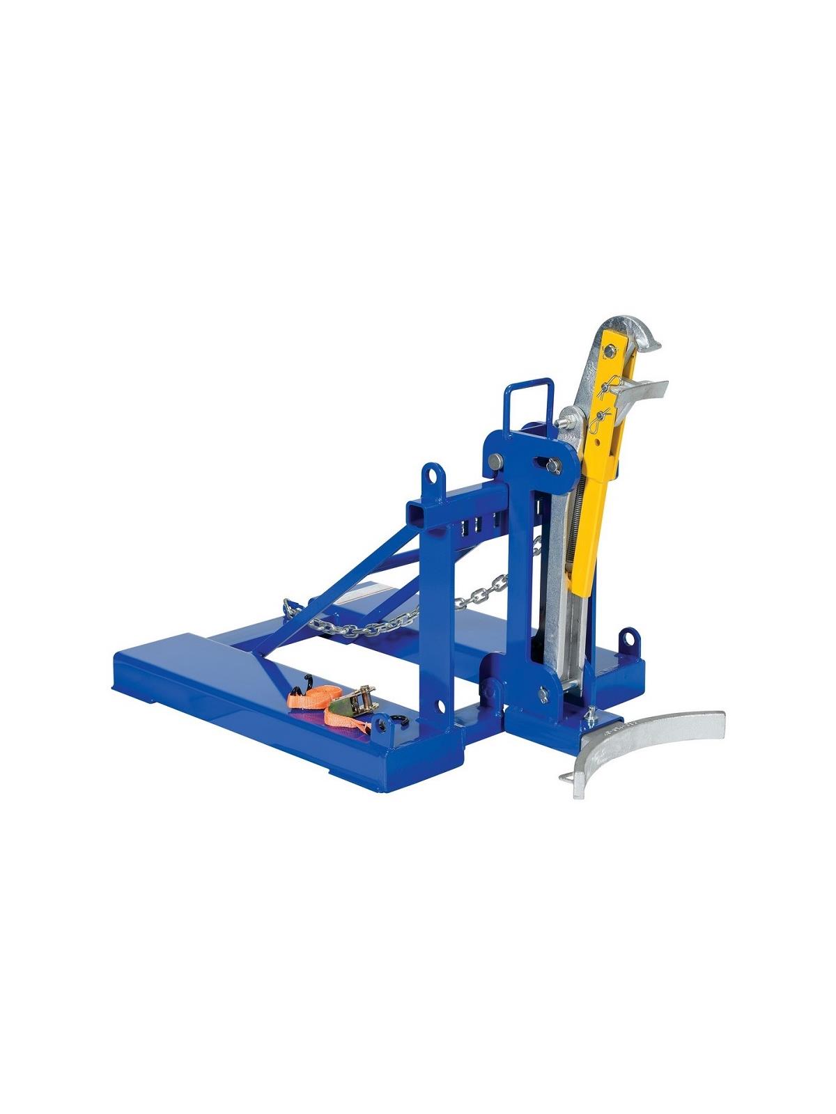 This time tested and proven design allows a fork truck operator to easily secure, move and release drums without leaving the seat of the fork truck. For use with open and closed head plastic, steel and fiber drums with a top lip strong enough to support the weight of the drum. Choose single drum or double drum configuration. Works with 30 and 55 gallon drums. All-welded sturdy construction. Low maintenance design. Includes safety chain to secure unit to carriage of fork truck. Powder coat blue finish. Fork pockets 7-1/2"W x 2-1/2"H usable. FOB Shipping Point.