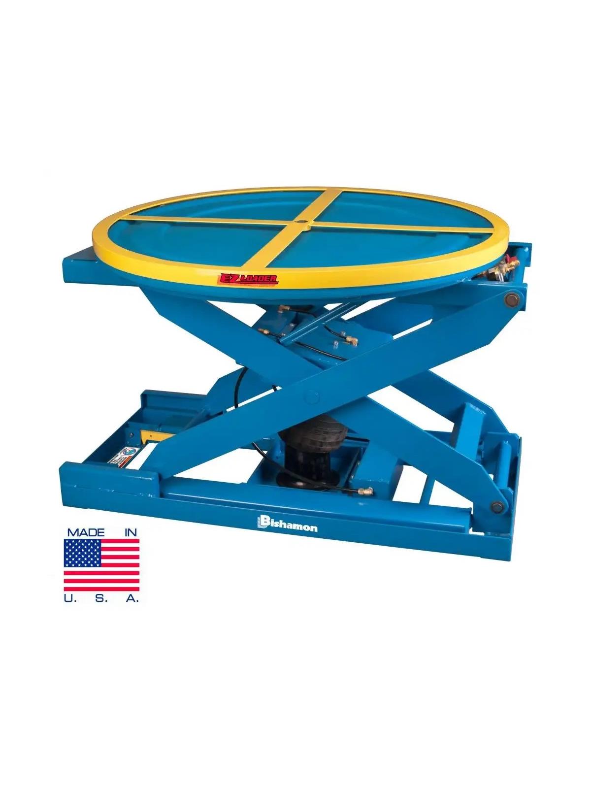 State of the art automatic pallet positioner now adjustable without changing air pressure!. Self-leveling design automatically keeps the top of the load at a convenient working height to help eliminate bending and improve productivity. Integral rotator ring helps eliminate reaching and stretching. The EZ Loader is easily transported with a fork truck or via optional portability packages.