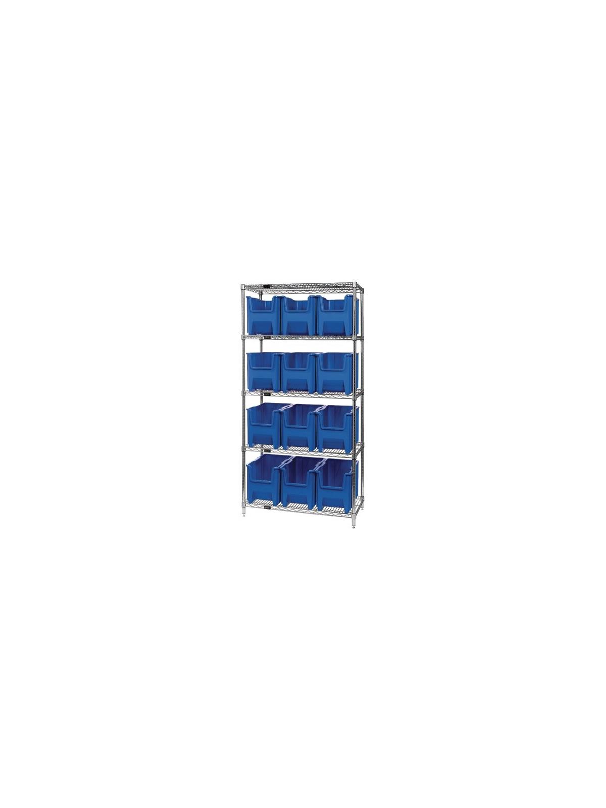 Combine stylish chrome shelving and parts organizing bins. Sturdy shelving unit supports loads up to 800 lbs. Choice of bins. Easy to assemble. Giant Hopper Bins are available in Gray, Blue, or Red. FOB Shipping Point.