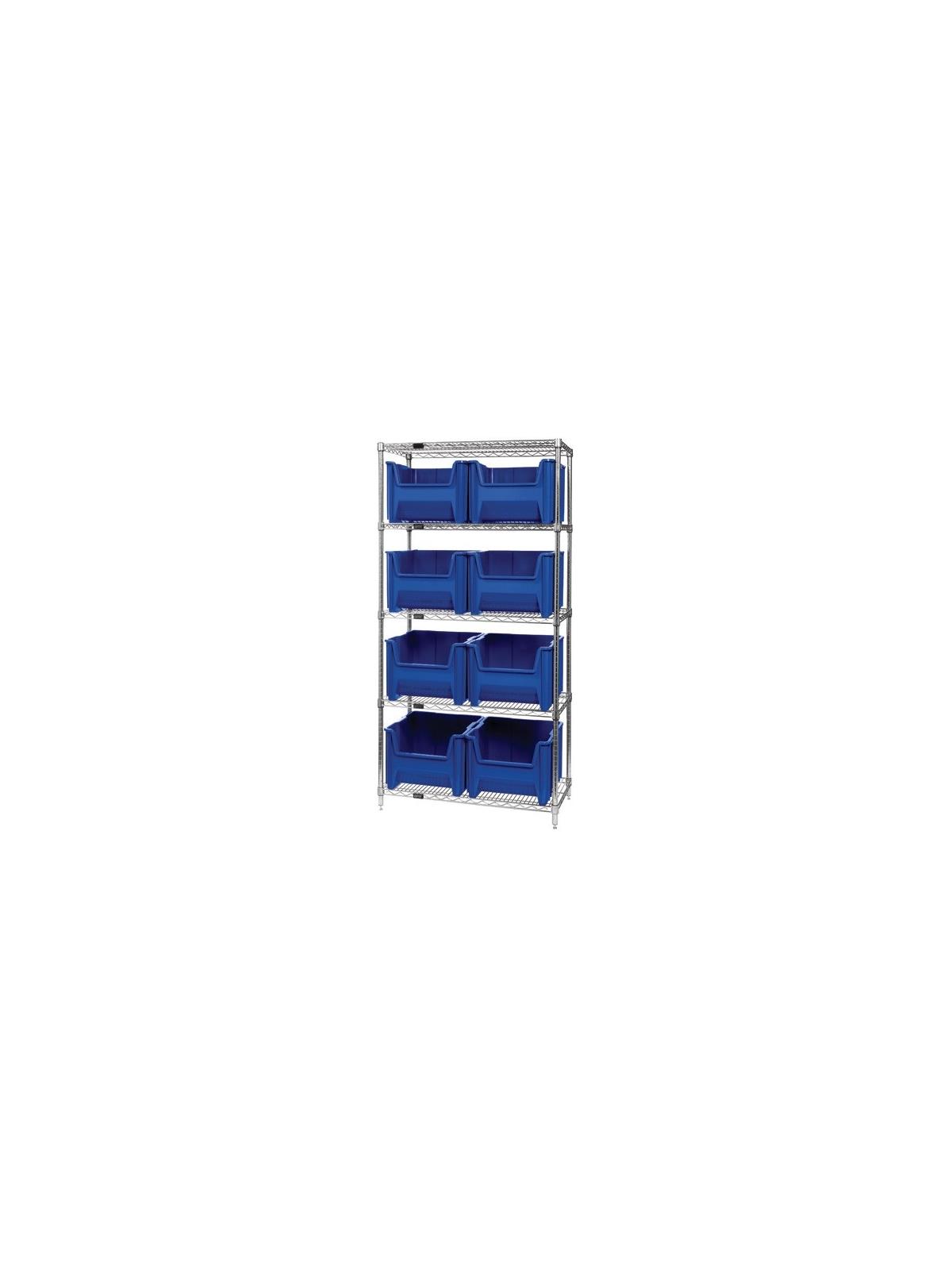 Combine stylish chrome shelving and parts organizing bins. Sturdy shelving unit supports loads up to 800 lbs. Choice of bins. Easy to assemble. Giant Hopper Bins are available in Gray, Blue, or Red. FOB Shipping Point.