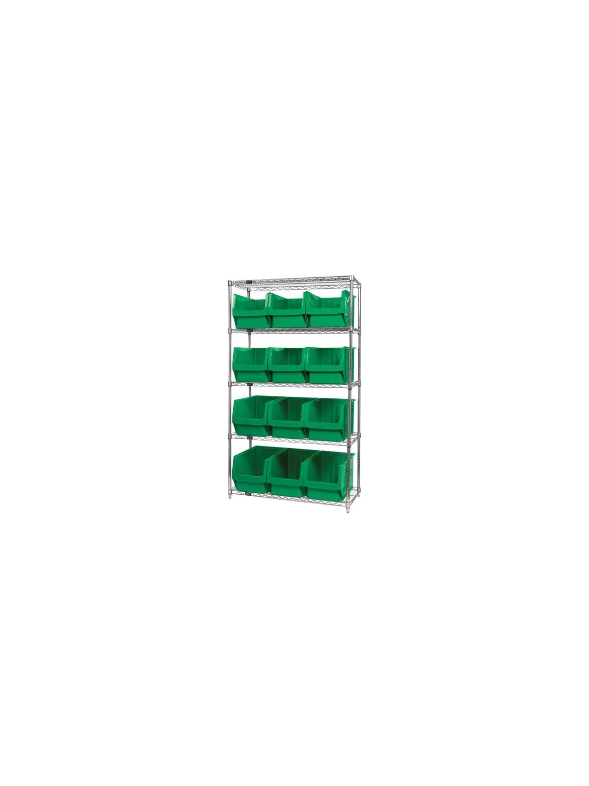 Combine stylish chrome shelving and parts organizing bins. Sturdy shelving unit supports loads up to 800 lbs. Choice of bins. Easy to assemble. Magnum Bins are available in Blue, Yellow, Green, Red, or Black. FOB Shipping Point.