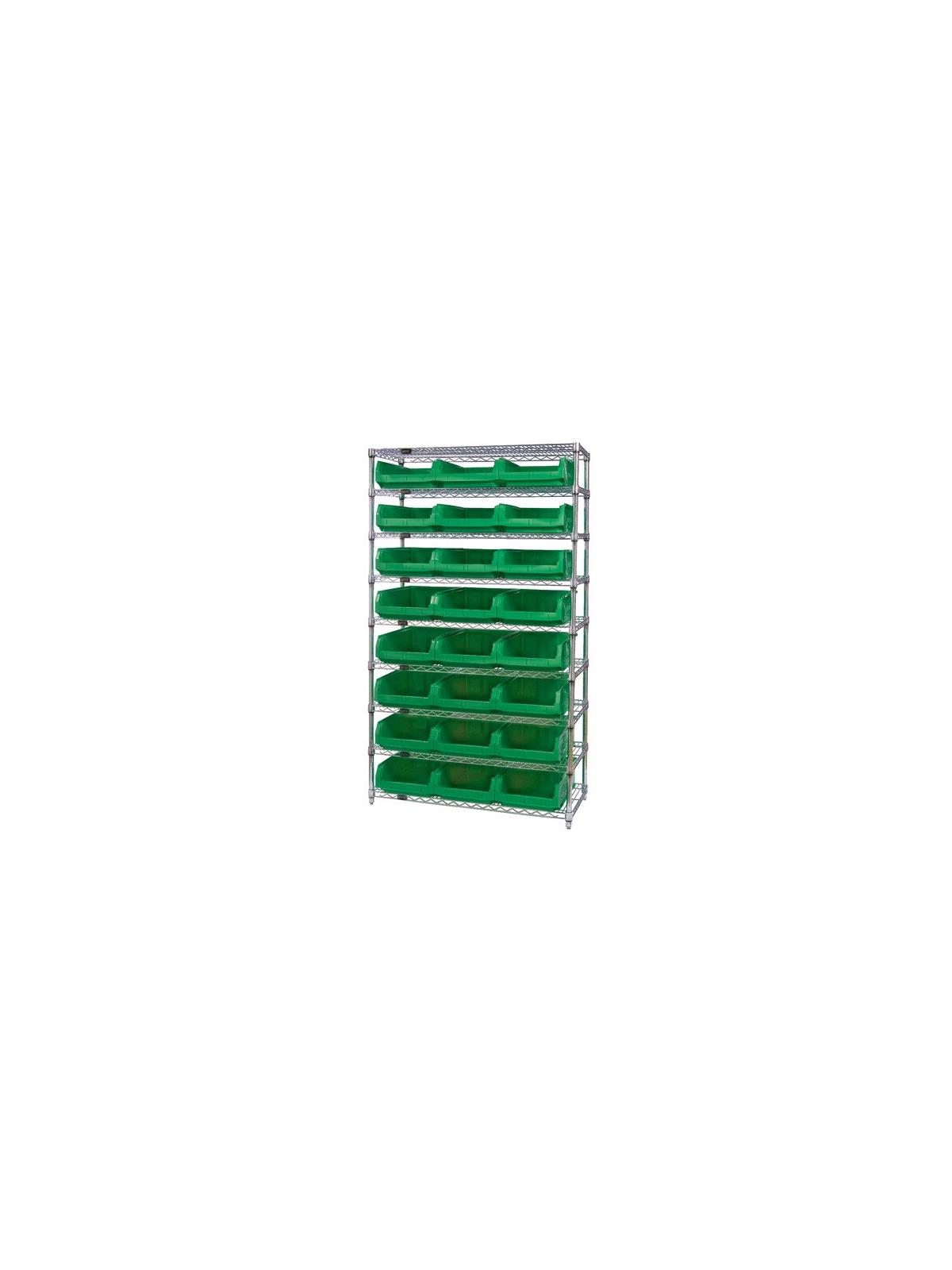 Combine stylish chrome shelving and parts organizing bins. Sturdy shelving unit supports loads up to 800 lbs. Choice of bins. Easy to assemble. Magnum Bins are available in Blue, Yellow, Green, Red, or Black. FOB Shipping Point.