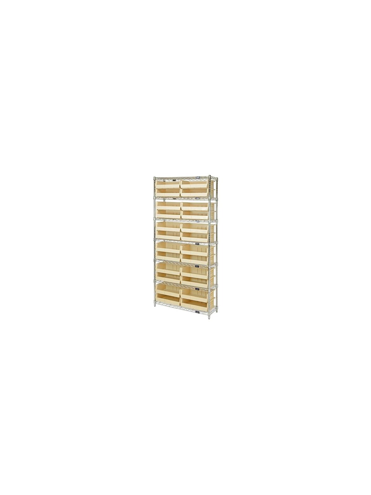 Combine stylish chrome shelving and parts organizing bins. Sturdy shelving unit supports loads up to 800 lbs. Choice of bins. Easy to assemble. Ultra Bins are available in Blue, Red, Yellow, Green, Ivory or Black. FOB Shipping Point.