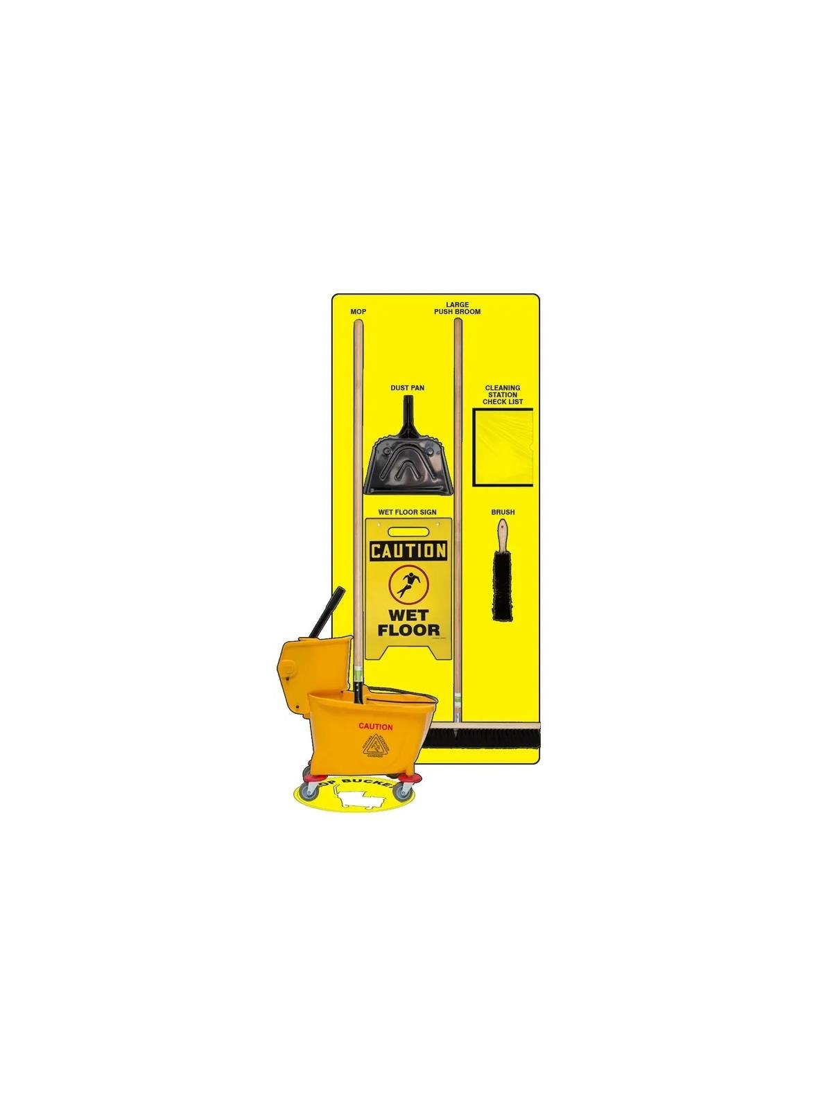If combo is chosen, kit comes with: 24" Push broom head, 8" Bench Brush, 60" Wood handle, Metal Dust pan, 60" Wood mop handle, Cotton Mop Head, 35 QT Yellow Mop Bucket w/Ringer, "Caution Wet Floor" Fold Up Sign, 17" Matching Round Floor sign for the mop bucket.