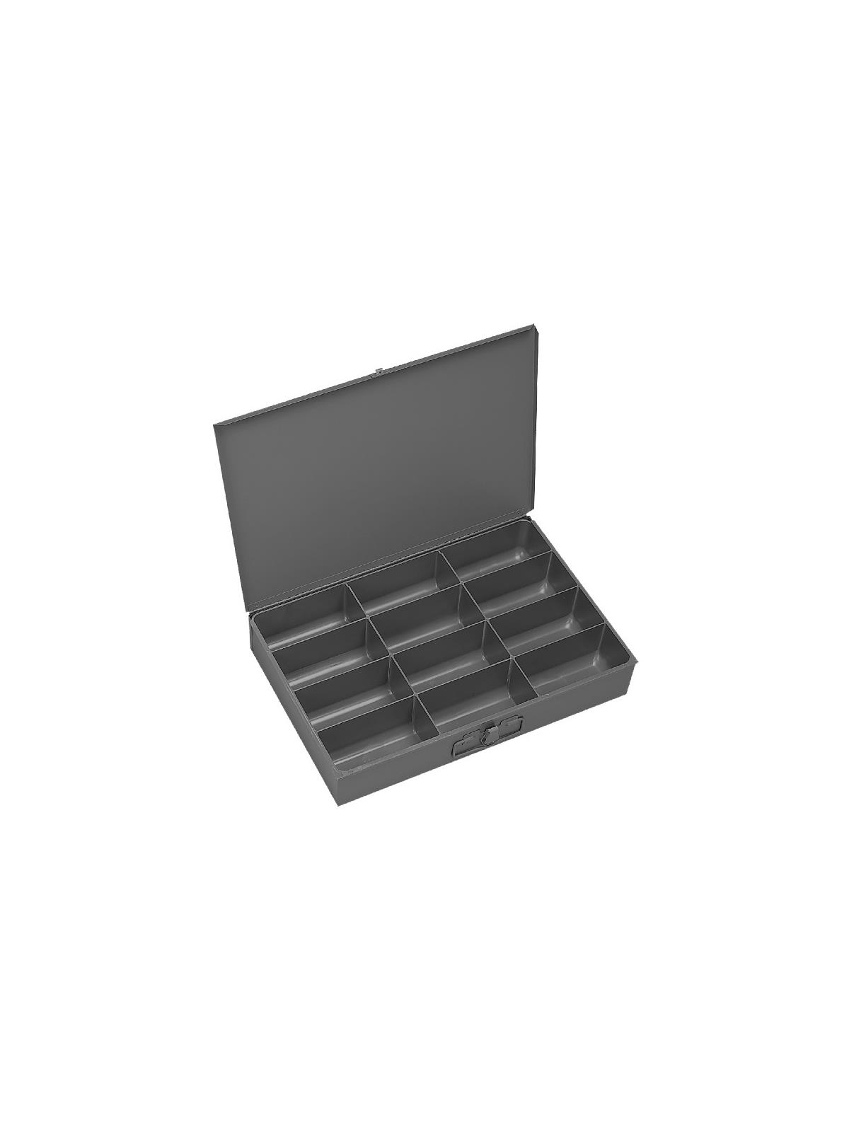 Efficient storage and organization for a variety of parts and components. Each compartment box interior is manufactured of polypropylene with scooped bottoms, both front and back for easy parts removal. Rugged steel, all-welded cabinets are reinforced for rigidity. Use on the workbench, counter or carry to the job site with convenient thumb-grip handles. Finished in acid and rust resistant Gray powder coating. FOB Shipping Point.