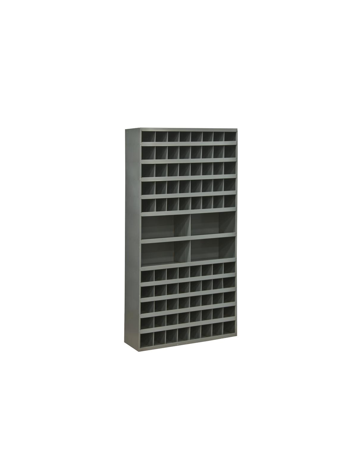 Fully hemmed 1-1/8" bin fronts to hold labels and retain parts. Roll-formed sides for increased strength and stability. Newly redesigned slope shelves. Ribbed and hemmed dividers provide added strength. Optional base and bin labels available. Ships fully assembled, ready to use. FOB Shipping Point.