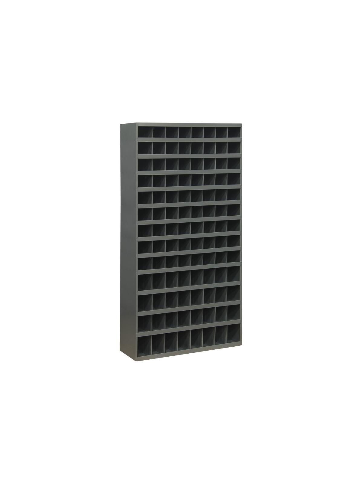 Fully hemmed 1-1/8" bin fronts to hold labels and retain parts. Roll-formed sides for increased strength and stability. Newly redesigned slope shelves. Ribbed and hemmed dividers provide added strength. Optional base and bin labels available. Ships fully assembled, ready to use. FOB Shipping Point.