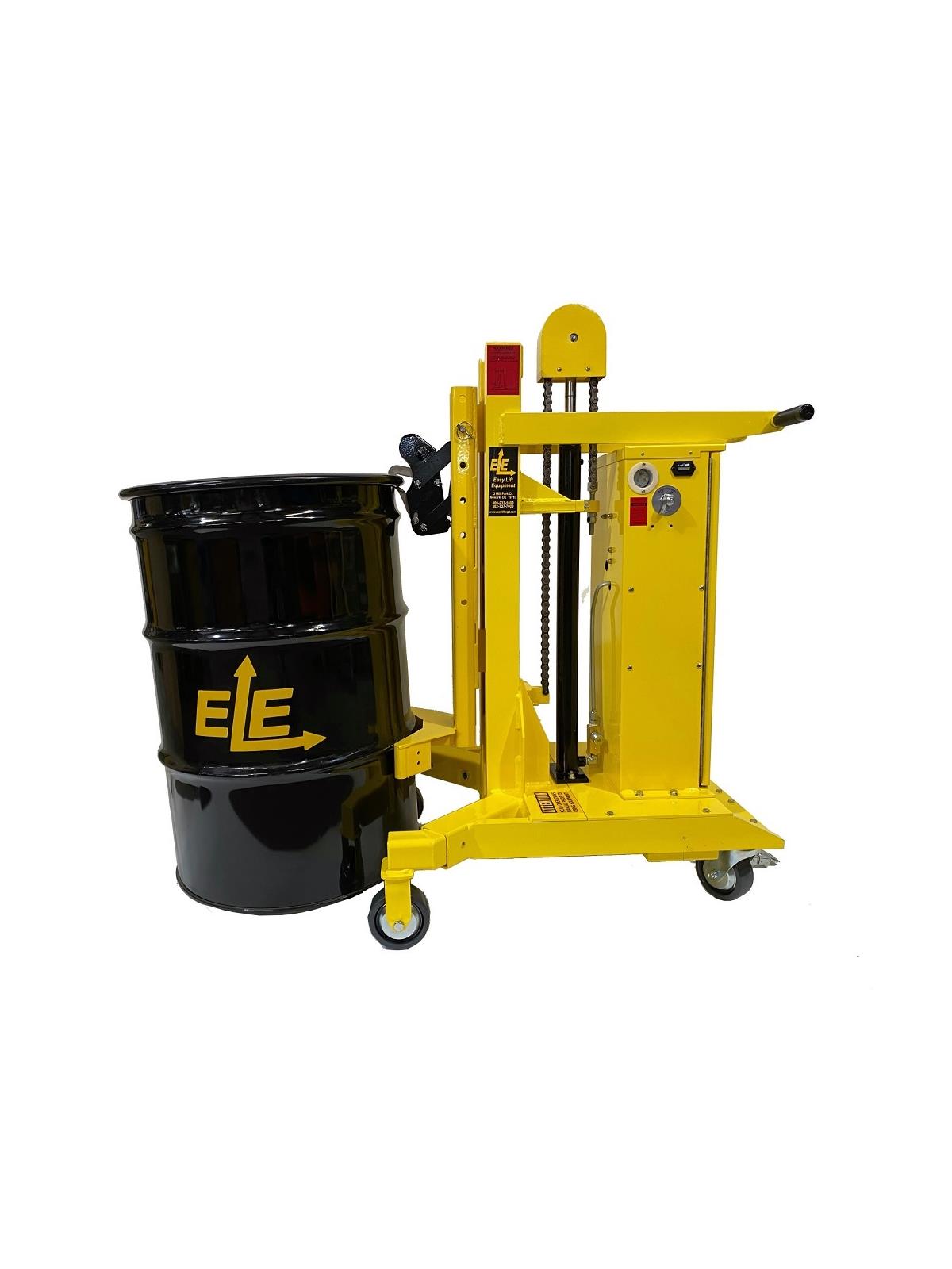 Easy Lift Equipment has developed an extensive line of ergonomic drum transporters since our original model was awarded a US patent in 1997. Designed for virtually maintenance-free operation our drum transporters help eliminate the risk of injuries caused by manhandling drums.  All models are available with both intrinsically or non-intrinsically safe scales; for quickly and accurately weighing drums without the need for floor scales. The EG1 and EG2L clamping heads are designed to handle a chimed plastic, steel, or fiber drum. All models are available with 20” of lift, with optional taller masts for double or triple stacking. Standard models are steel construction with safety yellow powder coating for durability. Optional FDA approved “metallic gray” powder coating, as well as full 304 stainless steel construction are also available for food and pharmaceutical applications. FOB Shipping Point.