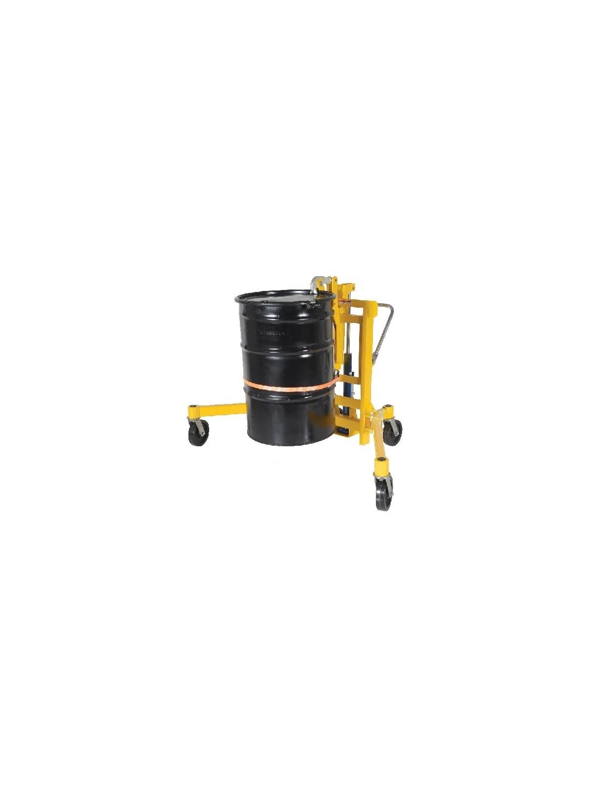 Unique portable unit designed to lift and transport steel, plastic, and fiber drums with a top lip. Steel jaw securely grips the top lip of the drum. Available with either a manual mechanical ratchet or foot pump hydraulic. Straddle legs rotate for access to drums on pallets. Units roll on four (4) 8" x 2" phenolic swivel casters. The push handle folds down for easy access to ratchet and foot pump. All welded steel construction. Baked-in powder coated toughness with a safety yellow finish. FOB Shipping Point.