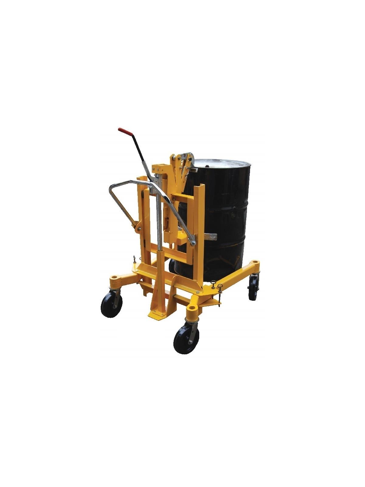 Unique portable unit designed to lift and transport steel, plastic, and fiber drums with a top lip. Steel jaw securely grips the top lip of the drum. Available with either a manual mechanical ratchet or foot pump hydraulic. Straddle legs rotate for access to drums on pallets. Units roll on four (4) 8" x 2" phenolic swivel casters. The push handle folds down for easy access to ratchet and foot pump. All welded steel construction. Baked-in powder coated toughness with a safety yellow finish. FOB Shipping Point.