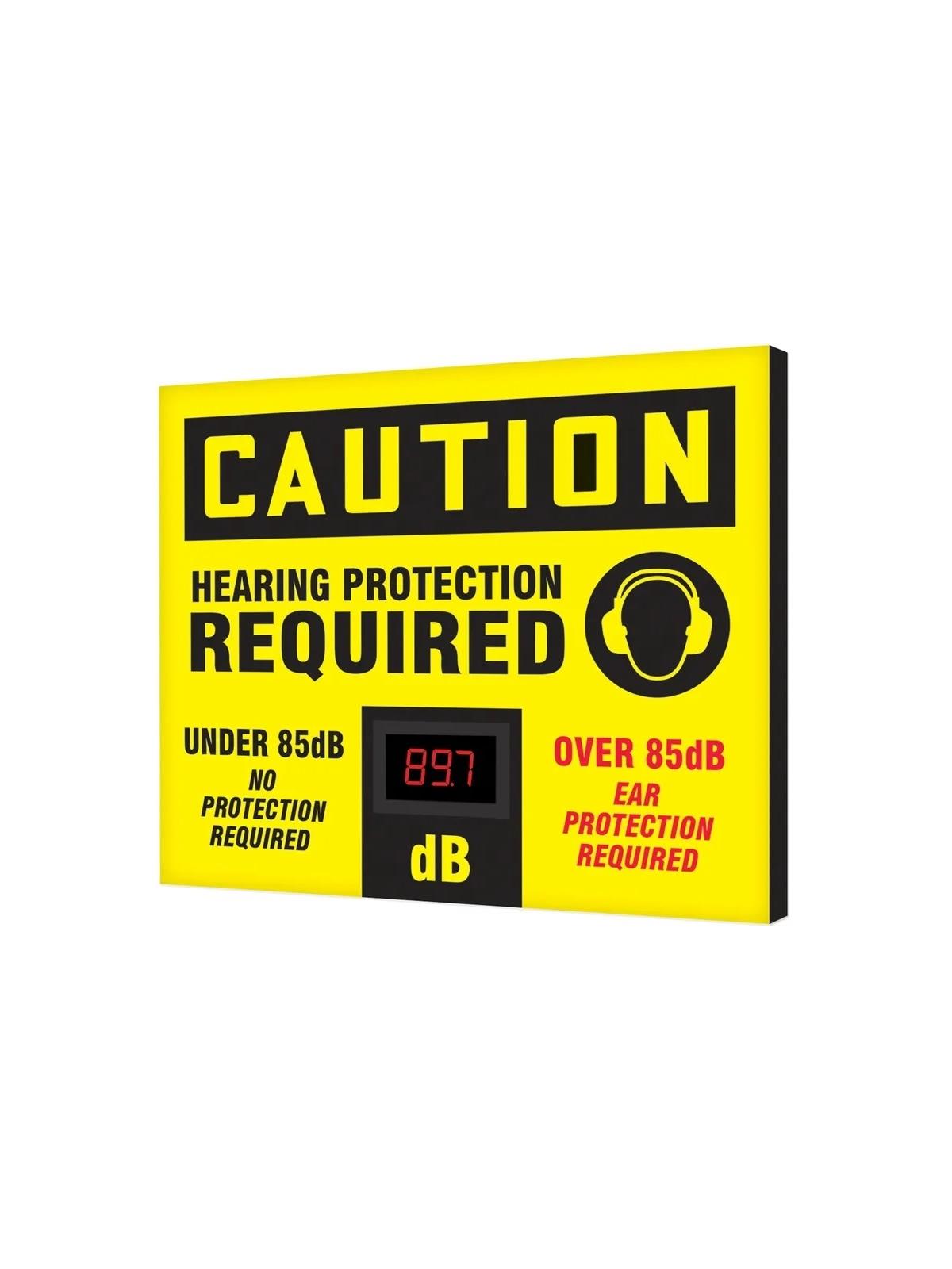 Electronic decibel meter signs constantly measure and display decibel level for employee safety. Encourage workers to use ear protection when sound levels are elevated and become a hazard to them. Striking visual edge safety sign captures employees' attention. Supports OSHA Standard 1910.95 that states employers must have in place an effective hearing conservation program whenever noise exposure equals or exceeds 85 db for 8 hours. FOB Shipping Point.