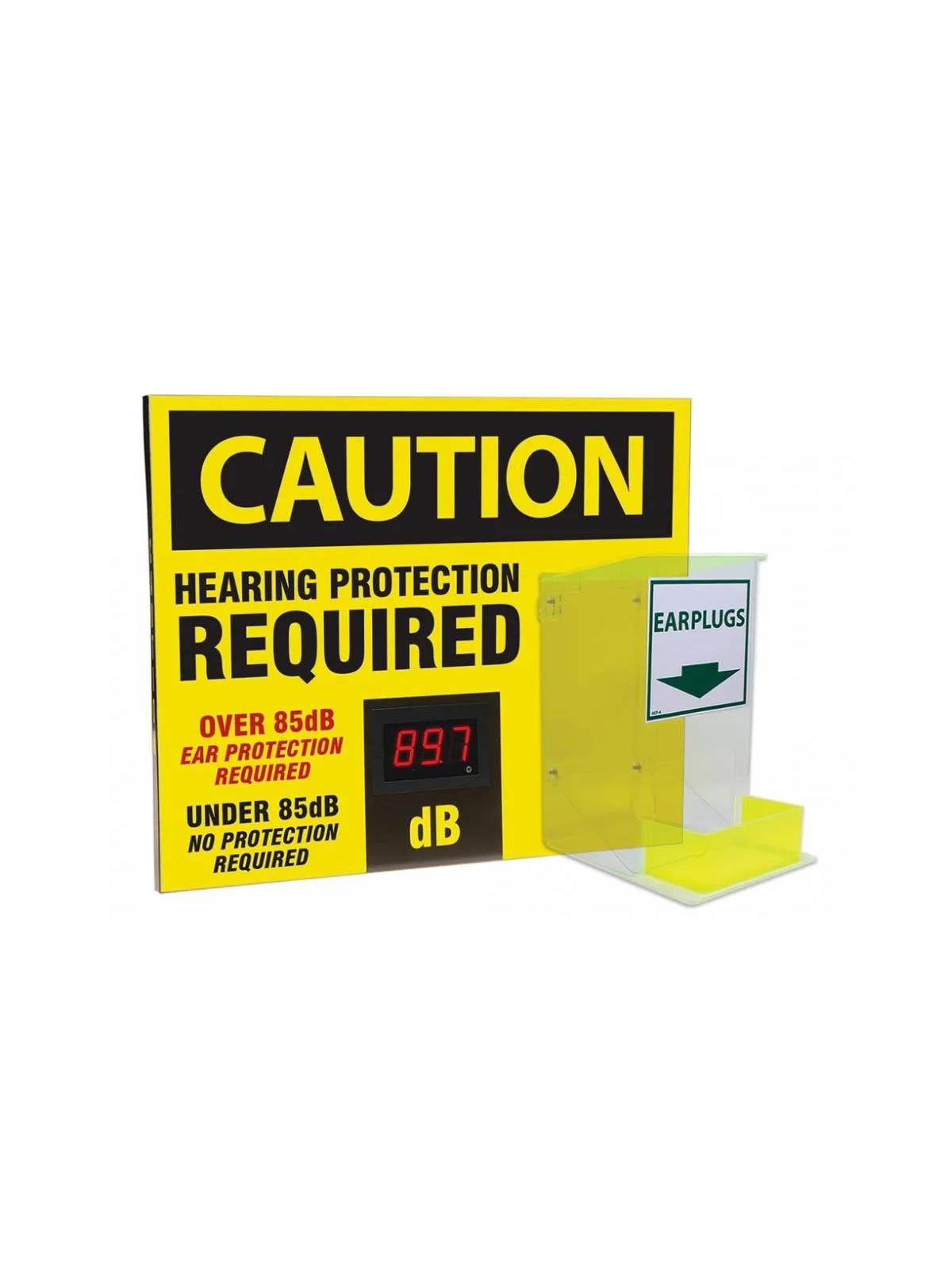 Description OSHA Caution Decibel Meter Sign: With Ear Plug Dispenser
