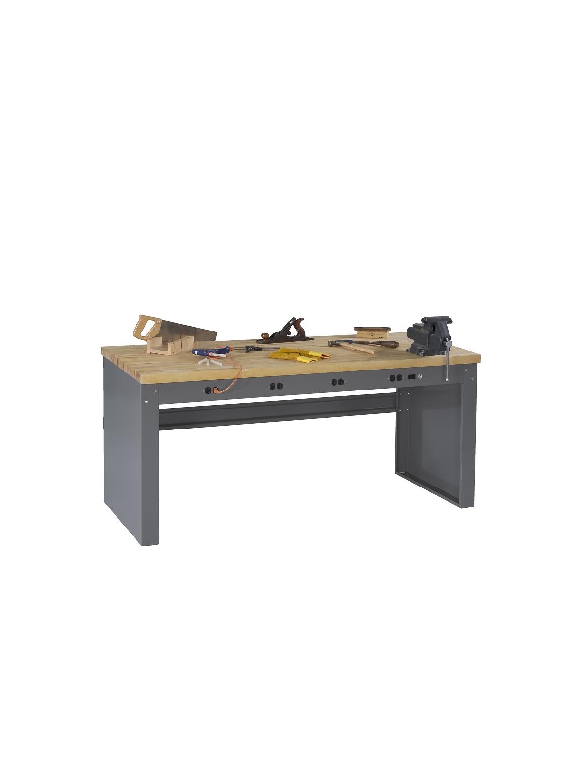 Channel-shaped stringer ties legs rigidly together. Front panel has knockouts for four duplex outlets and a switch (order optional wiring kit - See Related Items tab). Choice of tops: 1-3/4" thick solid hardwood butcher-block top or 1-1/2" thick steel top. Shipped unassembled. Medium Gray. FOB Shipping Point.