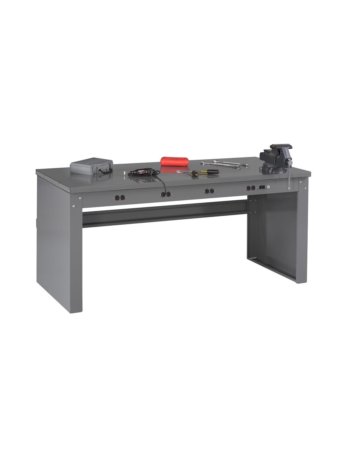 Channel-shaped stringer ties legs rigidly together. Front panel has knockouts for four duplex outlets and a switch (order optional wiring kit - See Related Items tab). Choice of tops: 1-3/4" thick solid hardwood butcher-block top or 1-1/2" thick steel top. Shipped unassembled. Medium Gray. FOB Shipping Point.