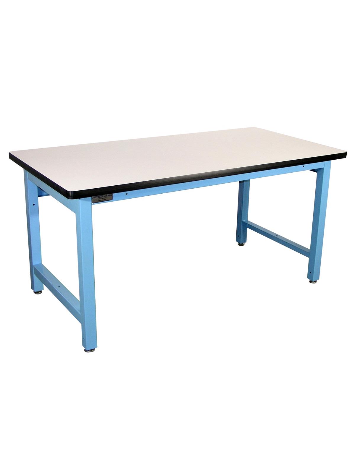 Handsome work station provides efficient pull-pin height adjustment. Industrial grade features include 16 ga. 2" square legs, 2" thick front and 8" thick back rails. Safely handles 1000 lb capacity loads.