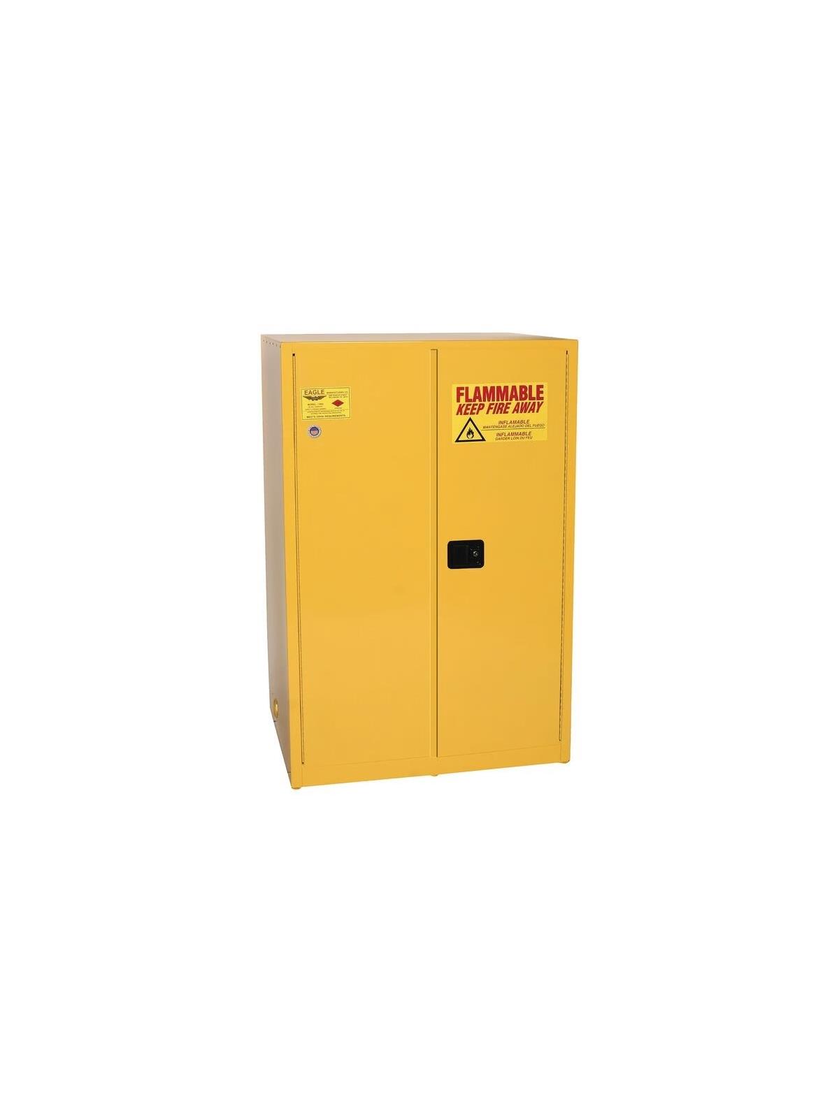 Eagle flammable storage cabinets come in yellow high gloss powder finish with red warning, grounding attachment, 3-point key lock, and 2-inch raised leakproof door sill. Each shelf is adjustable, supported by four brackets, and can support 350 pounds. All our metal cabinets meet NFPA Code 30 and OSHA requirements. Flammable cabinets help keep flammable liquids near work areas safely. Constructed of 18-gauge steel, all cabinets feature reinforced double-wall construction with air space on the sides, top, bottom, back and doors. Flammable cabinets, also known as fire cabinets, come in standard design, tower cabinets with legs, wall mounted cabinets, under counter cabinets, and add-on cabinets. FOB Shipping Point.
