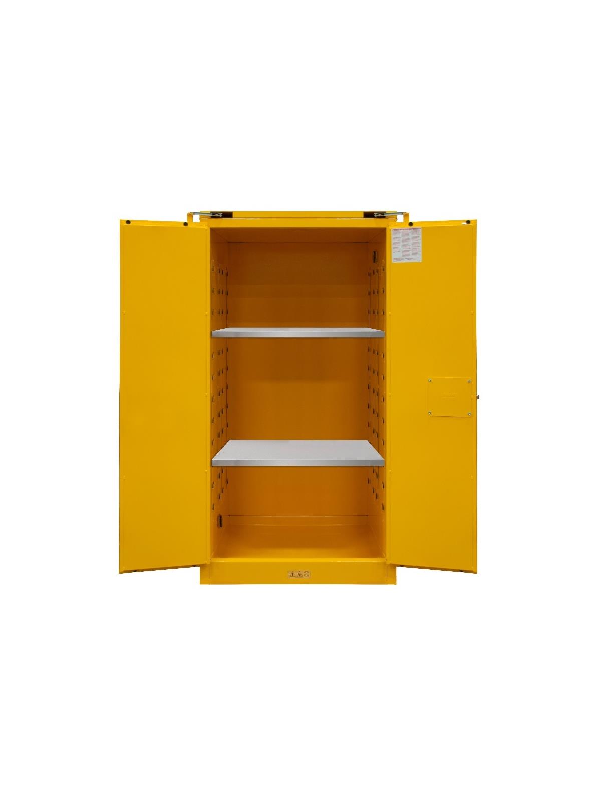 Flammable Storage Cabinets are required by OSHA and UFC in commercial and industrial facilities where flammable liquids are used and stored. Cabinets feature recessed lockable paddle latch and 3 point locking systems which greatly improves security. Bunged air vents on each side of the cabinet allows for greater ventilation. Constructed of all welded Heavy Duty Steel.