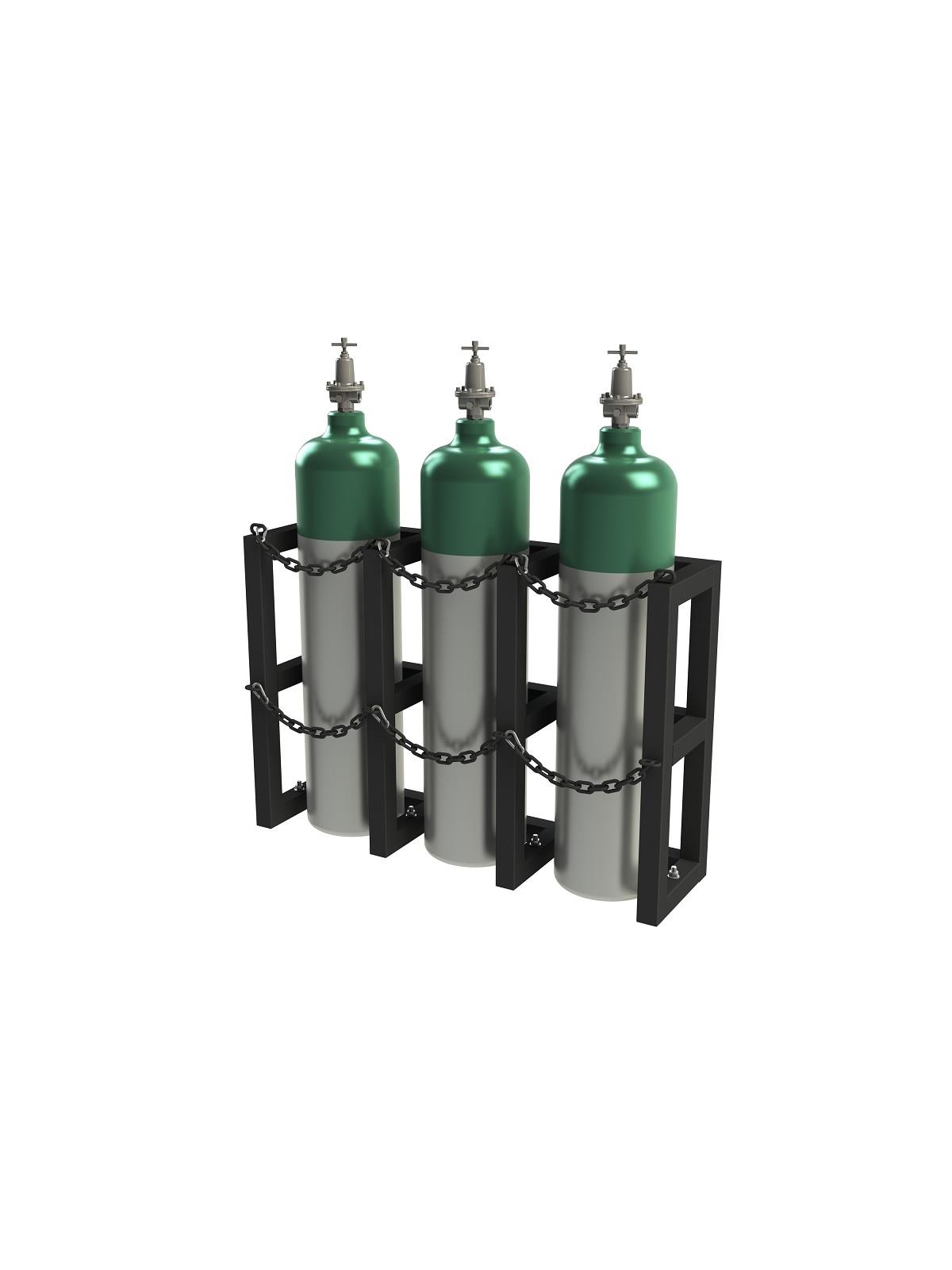 3 gauge, steel tube material can be secured to the floor with included concrete anchors. Includes chains to secure and align the gas cylinders. Organize types in their own rows. Built to meet and exceed quality and safety standards of OSHA, OSHPD, UFC, NFPA and CGA. Ships fully assembled, ready for immediate use. Black, textured, powder coat finish, good for outdoor or indoor use. FOB Shipping Point.