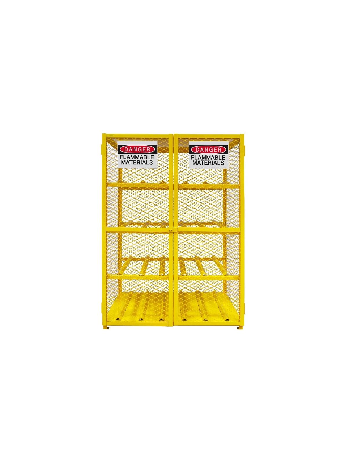Lockable cabinets store cylinders of fuel, LP gases and other flammable materials on easy-to-access cylinder cradles. "DANGER FLAMMABLE MATERIALS" signs on each door. Magnetic catch keeps doors safely shut when not locked. Heavy-duty butt hinges keep doors from sagging. Includes padlock hasp to secure contents - padlock not furnished. Made of sturdy 1-1/2" x 1/8" angle iron frame. Pre-drilled holes for lagging to floor. Durable, rust and acid resistant safety Yellow powder coat finish. When used properly, units are in full compliance with OSHA and NFPA standards. FOB Shipping Point.