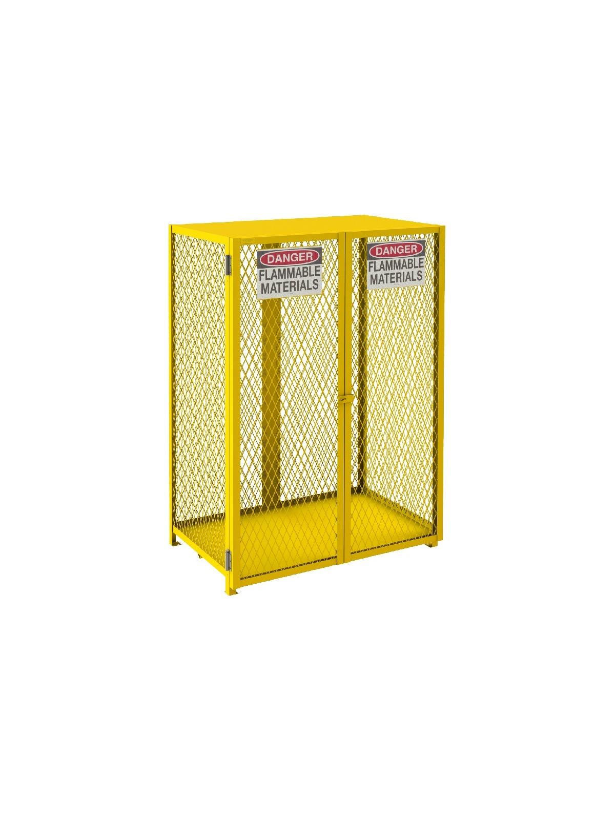 Lockable cabinets store cylinders of fuel, LP gases and other flammable materials on easy-to-access cylinder cradles. "DANGER FLAMMABLE MATERIALS" signs on each door. Magnetic catch keeps doors safely shut when not locked. Heavy-duty butt hinges keep doors from sagging. Includes padlock hasp to secure contents - padlock not furnished. Made of sturdy 1-1/2" x 1/8" angle iron frame. Pre-drilled holes for lagging to floor. Durable, rust and acid resistant safety Yellow powder coat finish. When used properly, units are in full compliance with OSHA and NFPA standards. FOB Shipping Point.