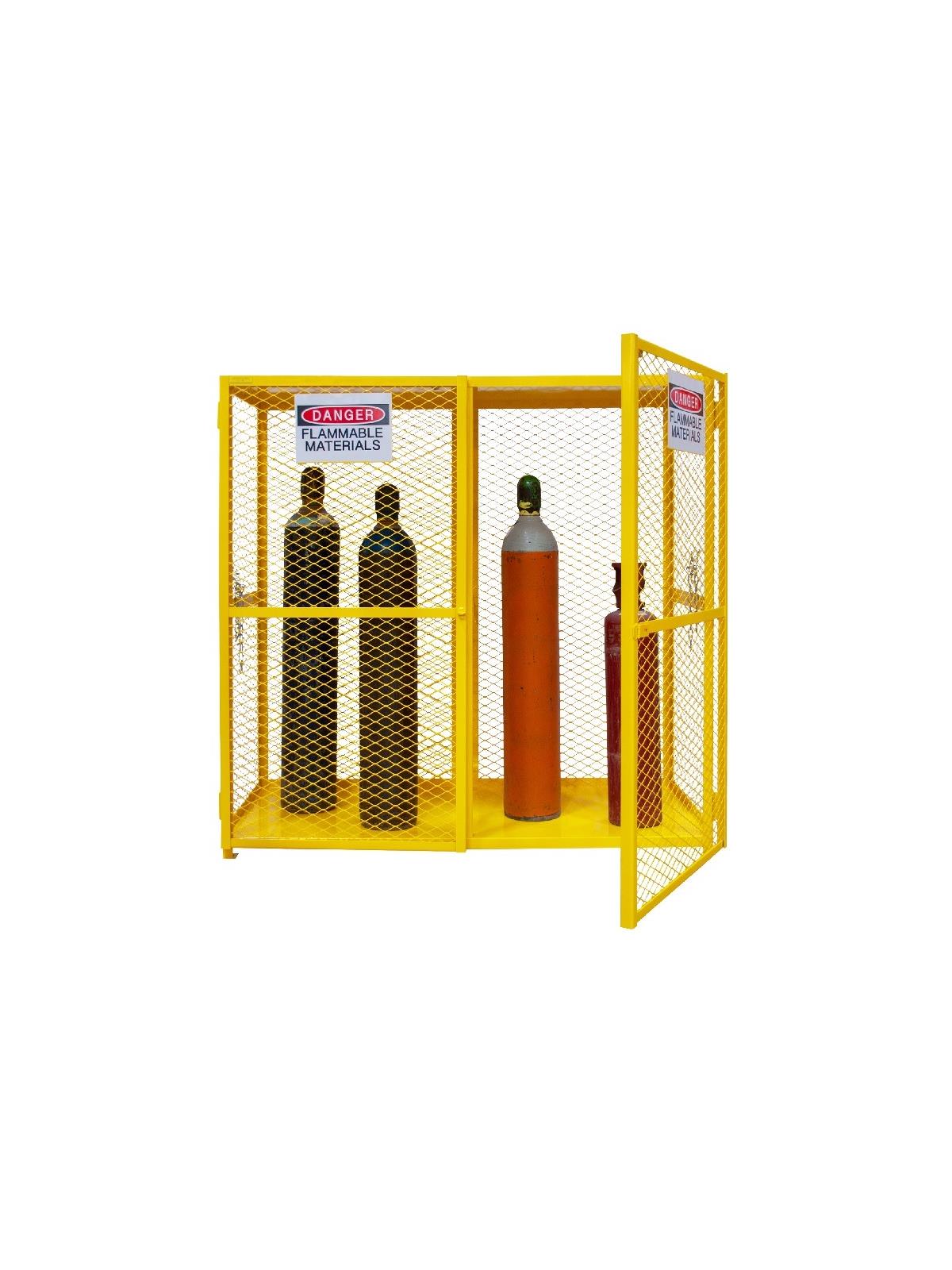 Lockable cabinets store cylinders of fuel, LP gases and other flammable materials on easy-to-access cylinder cradles. "DANGER FLAMMABLE MATERIALS" signs on each door. Magnetic catch keeps doors safely shut when not locked. Heavy-duty butt hinges keep doors from sagging. Includes padlock hasp to secure contents - padlock not furnished. Made of sturdy 1-1/2" x 1/8" angle iron frame. Pre-drilled holes for lagging to floor. Durable, rust and acid resistant safety Yellow powder coat finish. When used properly, units are in full compliance with OSHA and NFPA standards. FOB Shipping Point.