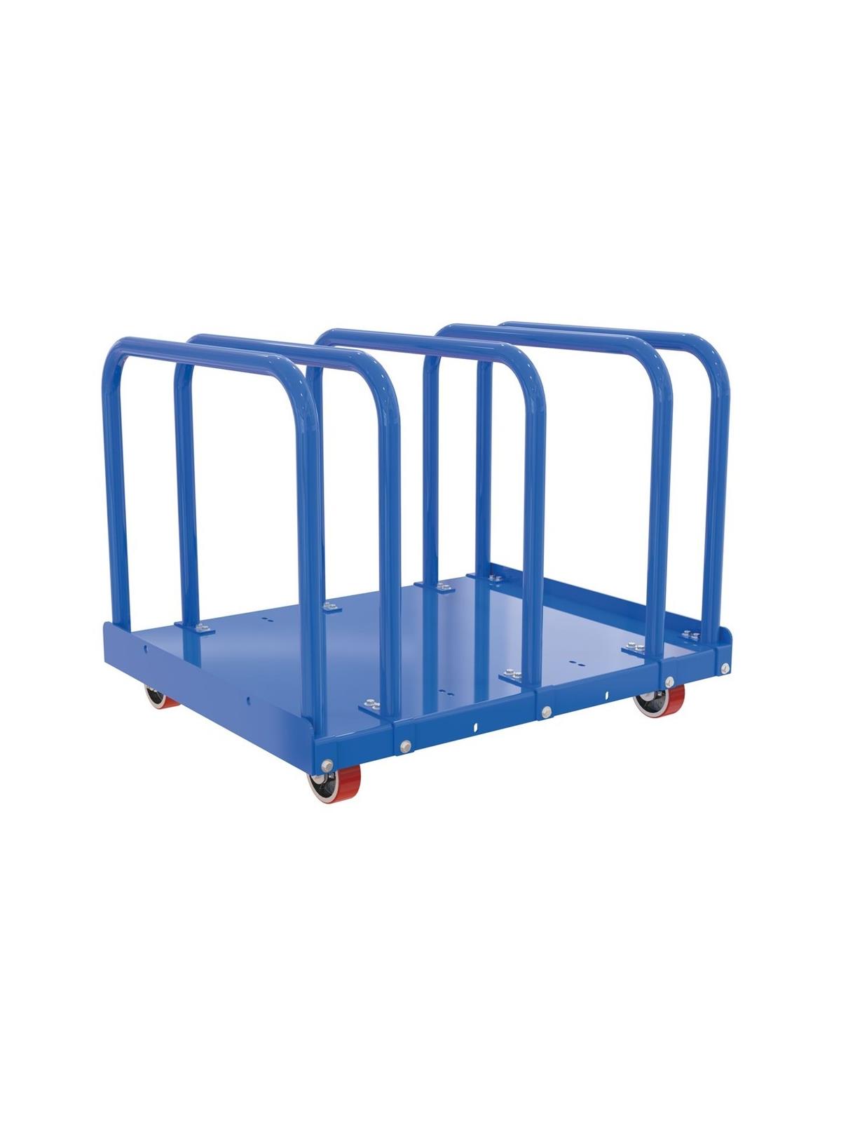 Heavy-Duty Panel Cart is the perfect panel cart for transporting plywood, drywall, paneling, doors, etc. Baked-in-powder-coated blue finish for toughness. Features a side retainer lip that keeps cargo on the deck. Two rigid and two swivel with brakes 5 x 2" poly-on-steel casters included. Overall height is 34". FOB Shipping Point.
