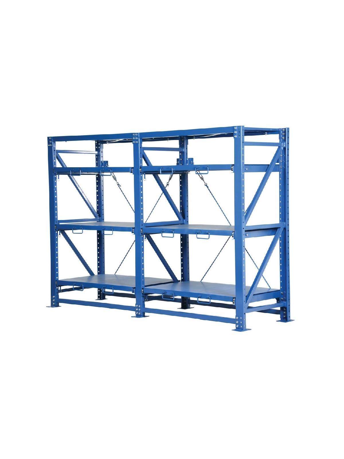 Roll-out shelving racks store heavy dies, fixtures, and machinery. Capacity per shelf is 1,500 pounds evenly distributed with a total uniform capacity of 6,000 pounds. Shelves roll out for convenient loading and retrieving. Can be easily loaded and unloaded with a crane, overhead hoist, forklift, or stacker. Individual shelf heights are adjustable on 2-3/8" centers. Features 10 gauge steel shelves that can extend 20", one (1) at a time, and be locked in the extended position for maximum safety. Top shelf is fixed, non-adjustable. Add on units are available. All steel construction with baked-in powder-coated toughness. Ships unassembled. Three (3) shelves per side of the HVRSOR-120. FOB Shipping Point.