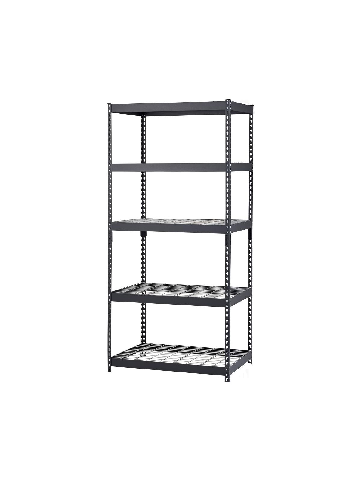 Industrial grade steel construction for lasting use. Five shelf levels with wire decking adjust in 1-1/2" increments to accommodate different size items. Each shelf holds up to 1,000 lbs. weight capacity, when evenly distributed. Wire decking provides air flow and will not chip or rust. Can also be assembled horizontally as two separate work height units. Durable textured black finish. FOB Shipping Point.