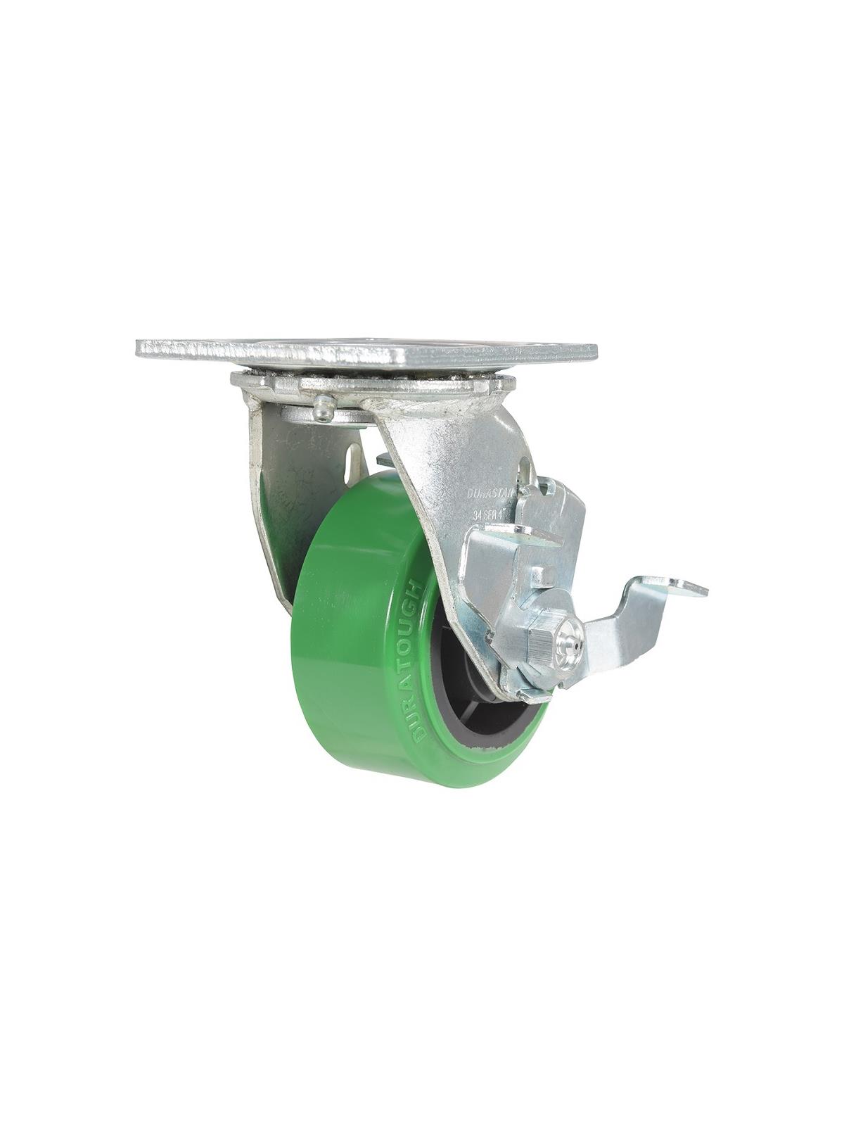 Made of professional grade polyurethane, designed with a new liquid cast flow affusion that ensures a 100% bond to core and 0% trapped air. The unique formula assists in avoiding disintegration that can occur in most plastic wheels, and provides five times longer wheel tread life than standard polyurethane. This caster is resistant to oil, grease, water and most solvents. Top plate size 4" x 4-1/2". FOB Shipping Point.