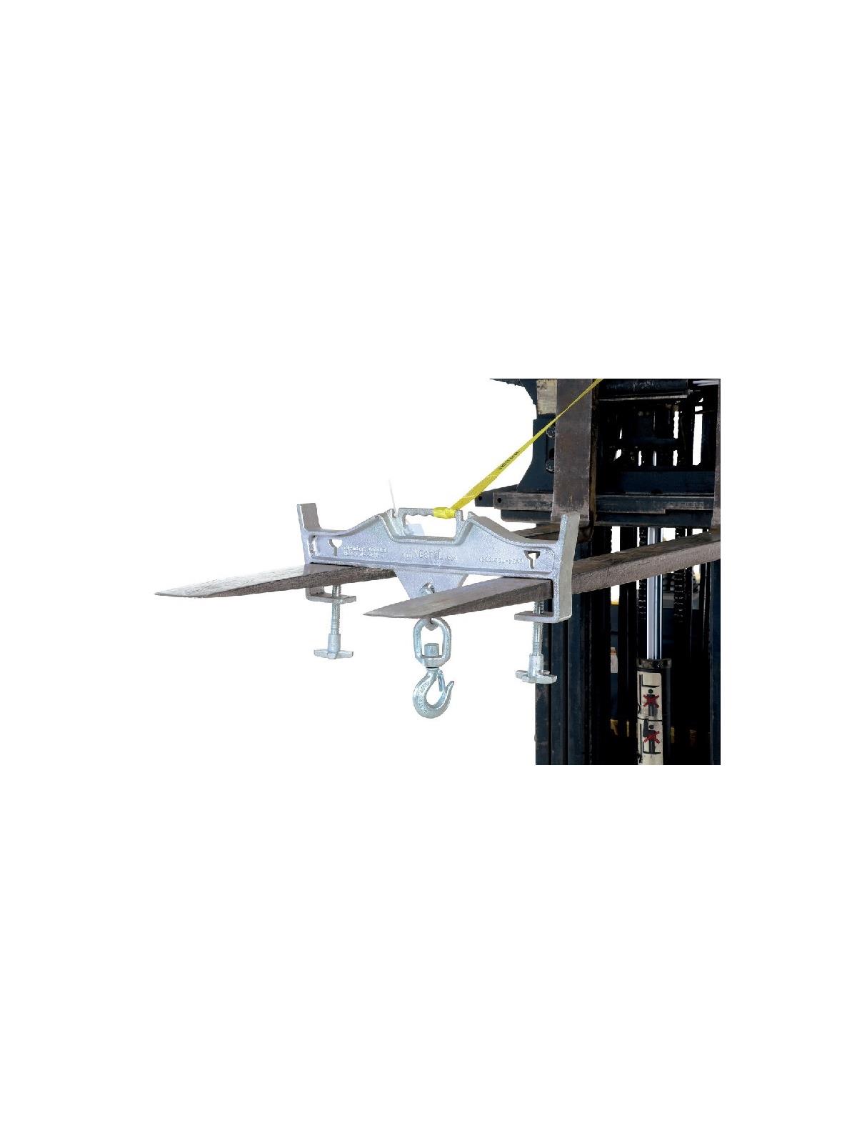 Easy to attach hoisting hook does not require special tools. Secured to the fork truck by means of a 48"L safety restraint and screw clamps. Available in single or double fork design. Both single and double attachments are zinc plated. Swivel or rigid hook with shackle included. FOB Shipping Point.