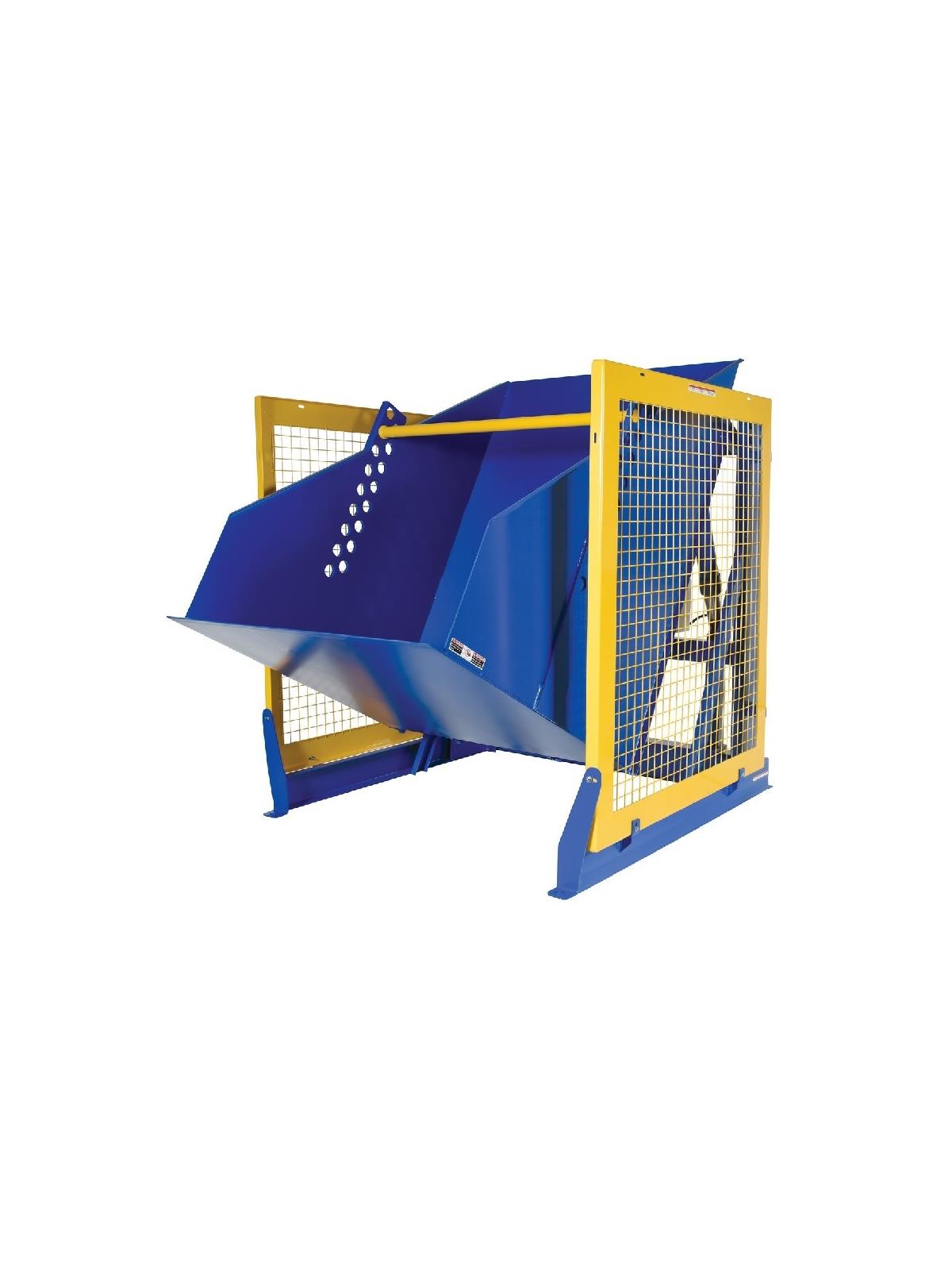 This ultimate dumper has advanced features from solid all welded steel construction to the Emergency Brass Velocity fuse in the cylinder. Main components include a 24V hand held pendant control, 56 frame motor, upper travel limit switch to reduce wear on the components. Safety features include: side rail guards, floor hold down brackets, adjustable hold down bar, 3,000 psi hydraulic component rating, integrated brass velocity fuse mounted inside the cylinder. Maximum rotation is 135°, yielding a 45° dump angle. Painted Royal Blue. FOB Shipping Point.