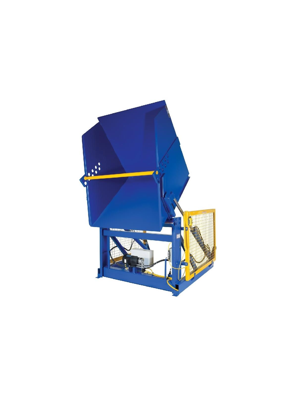 This ultimate dumper has advanced features from solid all welded steel construction to the Emergency Brass Velocity fuse in the cylinder. Main components include a 24V hand held pendant control, 56 frame motor, upper travel limit switch to reduce wear on the components. Safety features include: side rail guards, floor hold down brackets, adjustable hold down bar, 3,000 psi hydraulic component rating, integrated brass velocity fuse mounted inside the cylinder. Maximum rotation is 135°, yielding a 45° dump angle. Painted Royal Blue. FOB Shipping Point.