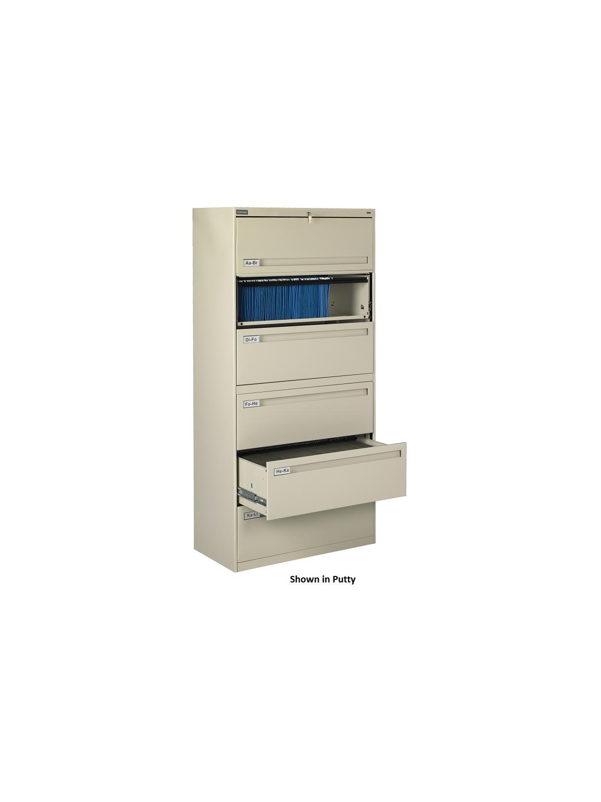 Drawers and doors have easy grip, full-width pulls with recessed label holders. Four leveling glides allow the unit to be leveled on uneven floors. To reduce risk of tipping, order two drawer lateral files with counterweights (suffix "W") for all applications except under a work surface in a workstation. Five and six-high units have retractable door(s) with roll-out drawer on top opening(s). Durable powder-coat paint finish. Available in Light Gray, Medium Gray, Putty, Sand and Black. FOB Shipping Point.