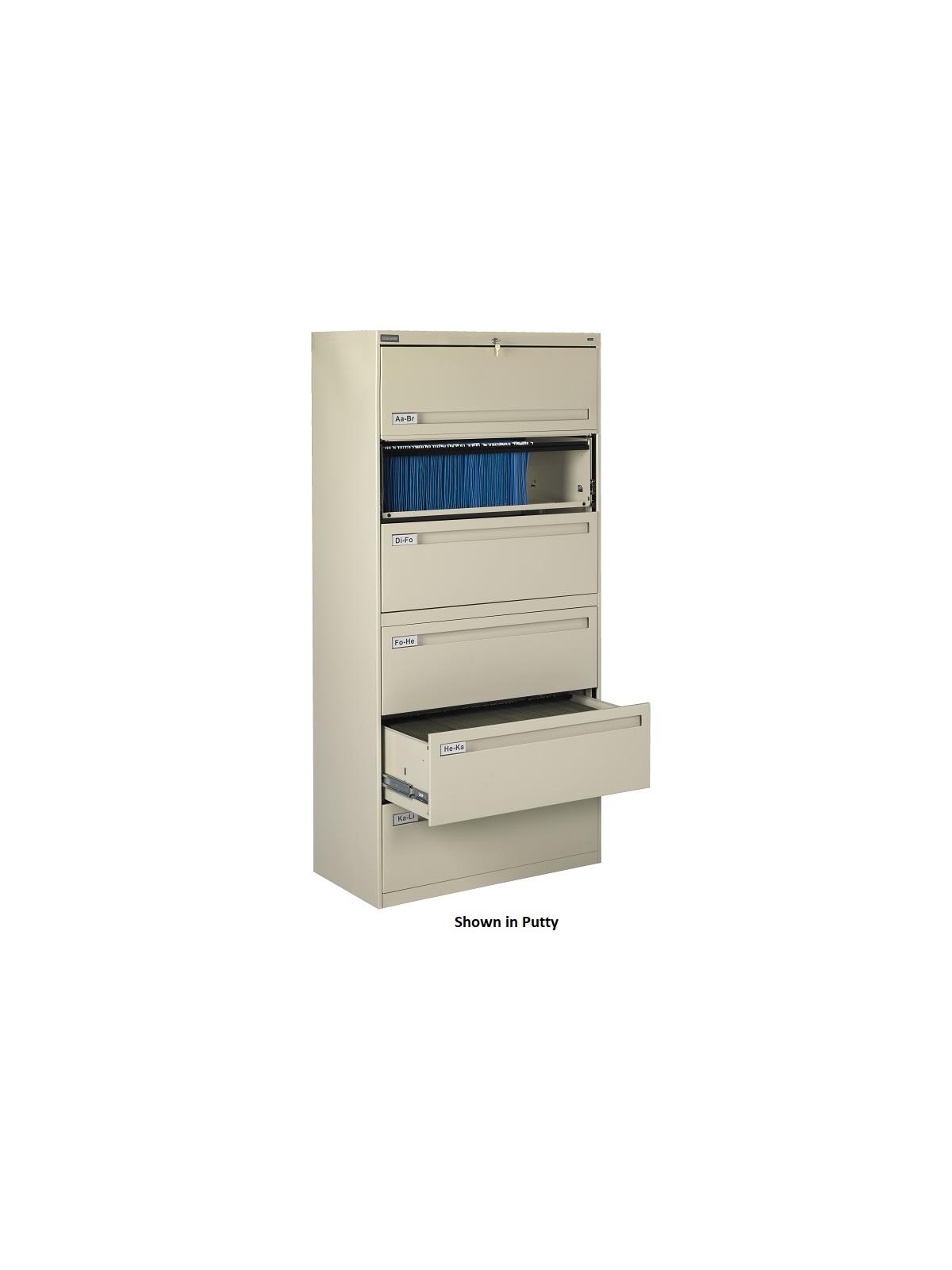 Drawers and doors have easy grip, full-width pulls with recessed label holders. Four leveling glides allow the unit to be leveled on uneven floors. To reduce risk of tipping, order two drawer lateral files with counterweights (suffix "W") for all applications except under a work surface in a workstation. Five and six-high units have retractable door(s) with roll-out drawer on top opening(s). Durable powder-coat paint finish. Available in Light Gray, Medium Gray, Putty, Sand and Black. FOB Shipping Point.